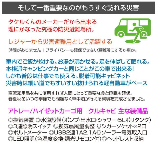 旅 トラベル キャンピングカー用品 防災グッズ 車中避難 地震 震災 緊急時 災害 対策 車中泊キット 換気扇 USBポート アトレー ハイゼット 専用設計