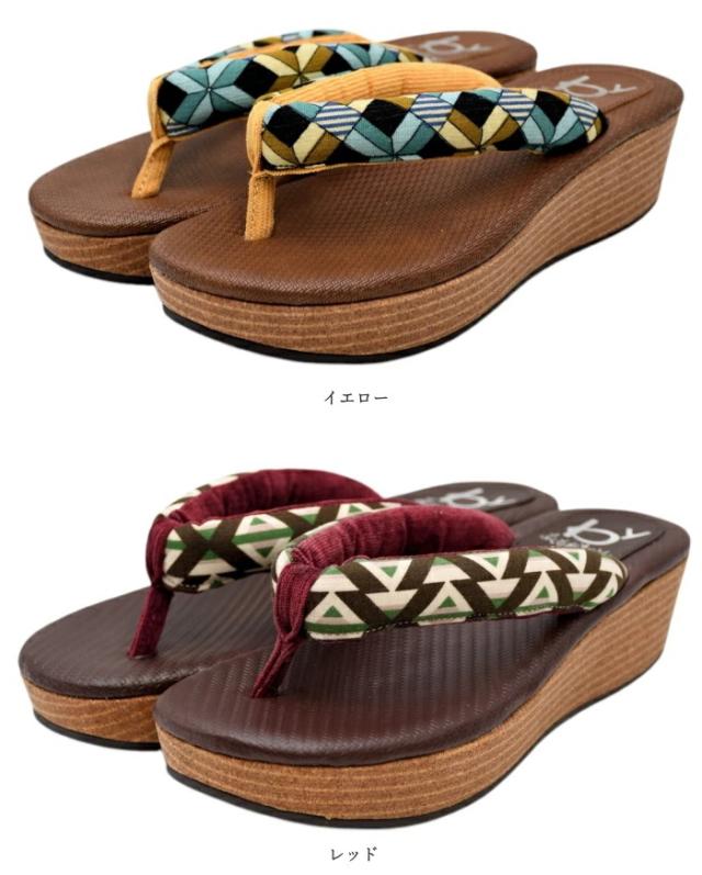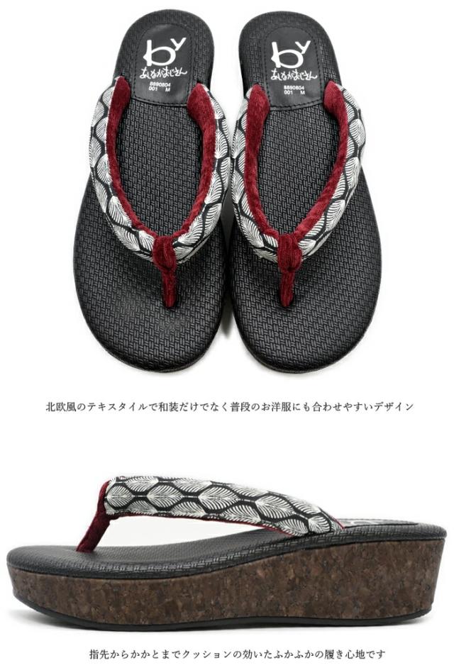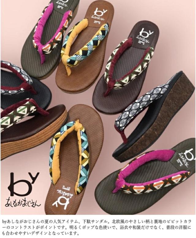 byあしながおじさんの夏の人気アイテム、下駄サンダル。北欧風のやさしい柄と裏地のビビット カラーのコントラストがポイントです。明るくポップな色使いで浴衣や和装だけでなく、いつも の私服にも似合う幅広く使える一足です。