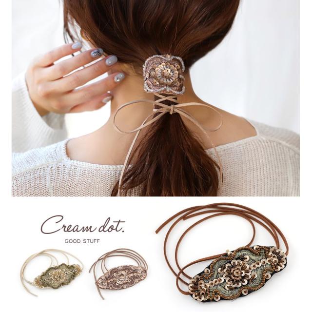 繊細な刺繍モチーフ×スエード調PUレザーコードの組み合わせが大人っぽいポニーフック。一つ結びに巻きつけるのはもちろん、トレンドのタイトポニーや玉ねぎヘアアレンジも簡単に完成♪