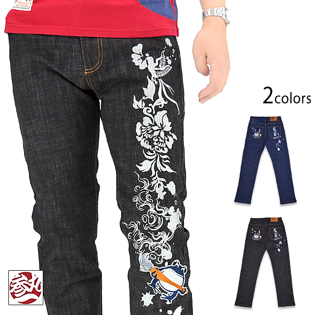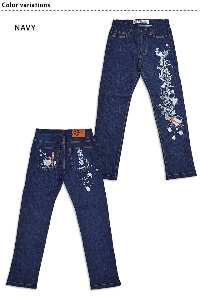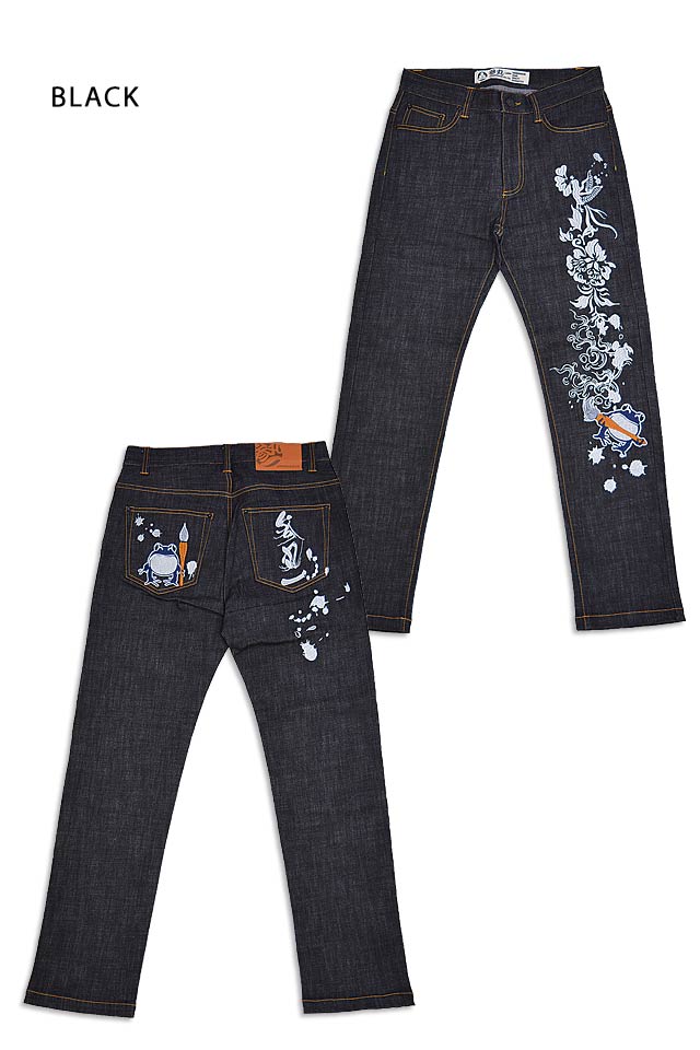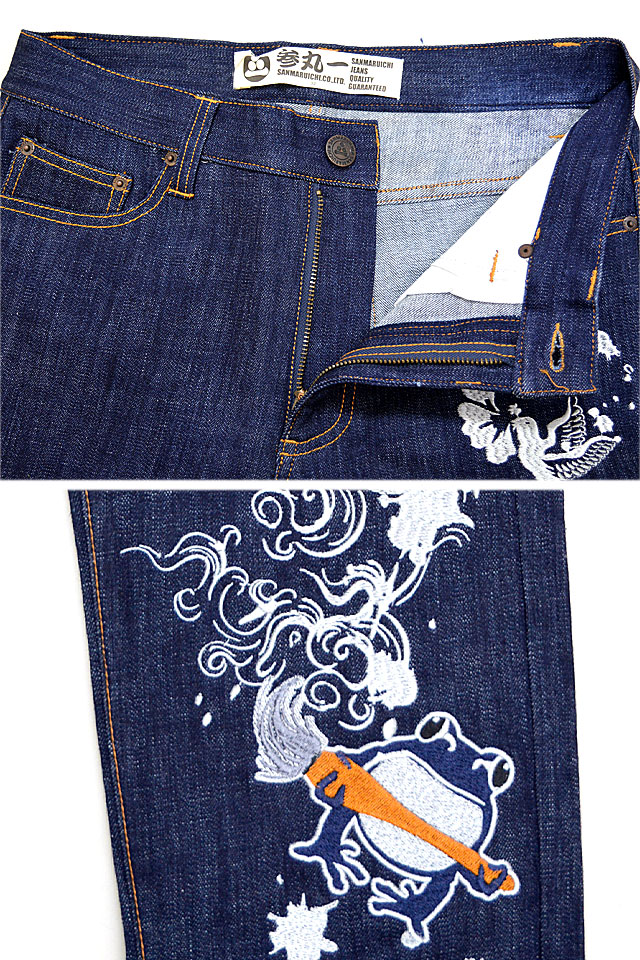 筆カエルデニムパンツ 参丸一 SPT-58003 和柄 和風 蛙 かえる 刺繍 ジーンズ さんまるいち