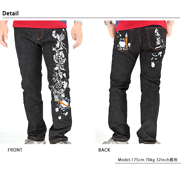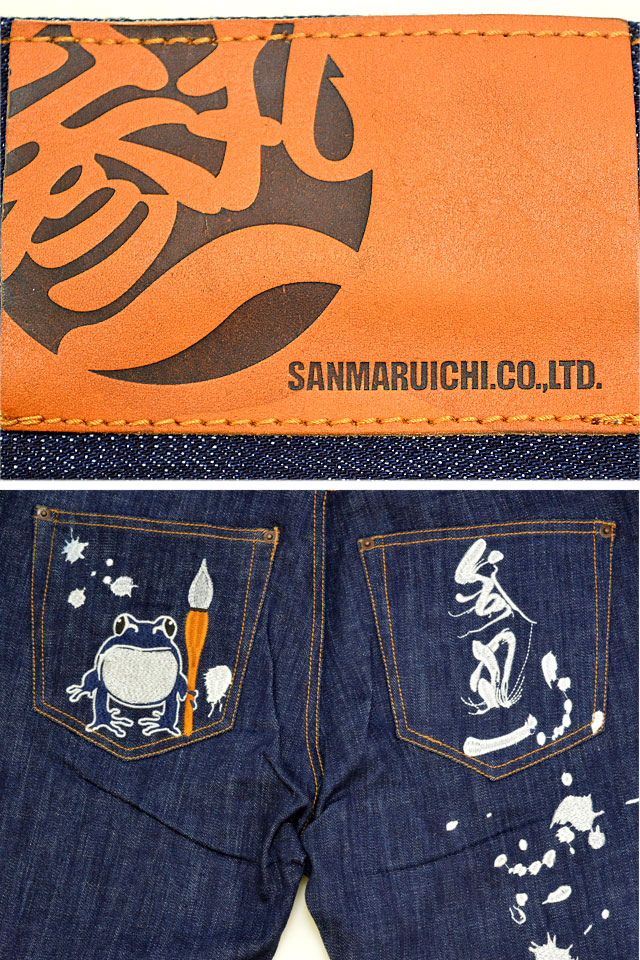 「参丸一」さんから「筆カエルデニムパンツ(SPT-58003)」のご紹介です。 筆で柄を入れる蛙の姿を描いた刺繍デニムパンツです。 フロント左腿には筆で描いたような花や波模様をデザイン。 バック右ポケットにはブランドロゴ、左ポケットには蛙を配し、周囲には飛沫が表現されています。 トップボタンには、ブランドオリジナルのものを採用。 | ||||||||||||||||||||||||||||||
