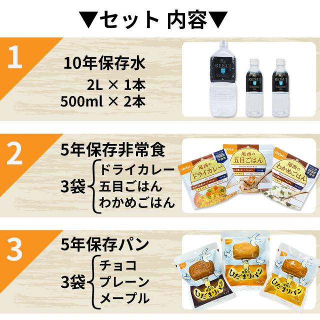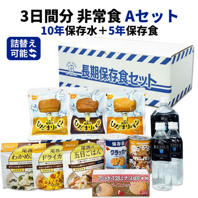 3日分 非常食セット 10年保存水+5年保存食 詰め替え可能 Aセット HS5A01 1セット 1人用 アルファ米 保存パン 保存水 長期保存 3日間生きのびる 防災食 保存食 尾西 防災グッズ 災害備蓄 乾パン カンパン クラッカー 缶詰め クッキー お菓子