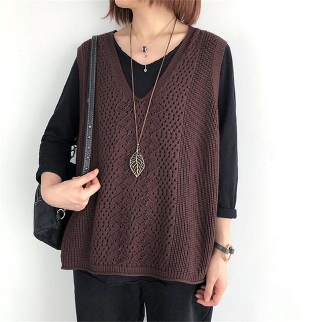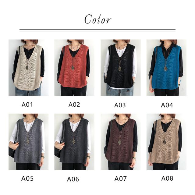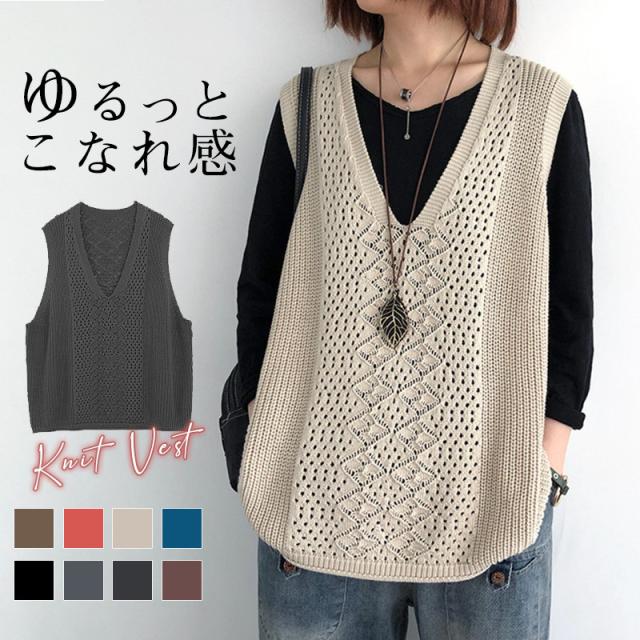 ジレベスト ニットベスト レディース 透かし編み 薄手 春夏 サマーベスト ノースリーブ vネック プルオーバー ゆったり レトロ 旅行 お出かけ