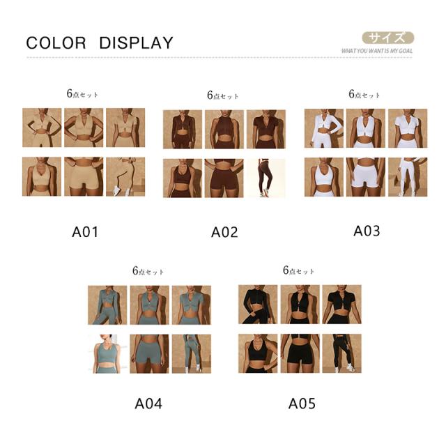 商品詳細:カラー:/A01/A02/A03/A04/A05サイズ:/S/M/L【商品説明】6点セット:長袖、半袖、ベスト、スポーツブラ、ショートパンツ、ロングパンツシンプルなデザイン、お手元のスニーカーにも合わせやすい。好みによって組み合わせを変えられるのも魅力的。デザインと機能を兼ね備えたおすすめのアイテムです。肌にフィットする素材は吸水と伸縮にも優れています。さらりとした質感で気持ちのよい着心地、汗による肌へのべたつきをし運動中の体もでドライな状態に素材構成:ナイロン、スパンデックスいろんなシーンで活躍している。・ランニング・エクササイズ・ボディメイク・ヨガ・フィールサイクル・ダンス・テニス・ボルタリング・ウォーキング・登山・キャンプ・子供の運動会・部屋着※伸縮がある生地を使用していますので、普段よりワンサイズ大きめがおすすめです※機械による生産過程において、「生地を織る際の糸の継ぎ目」や多少の「ほつれ」が生じる場合がございます。品質上の問題はございません。