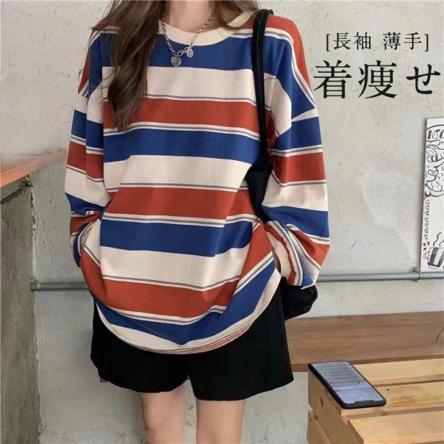 カットソー トップス レディース tシャツ 夏服 カジュアル インナー 重ね着 ストライプ 体型カバー 薄手 ロングt カジュアル ゆるTシャツ