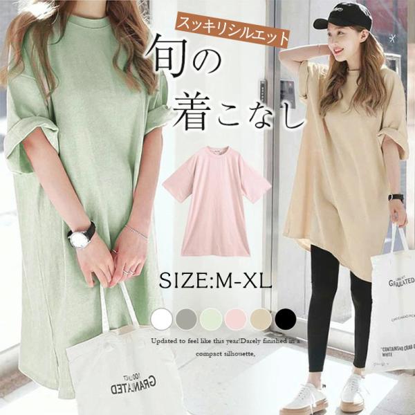 チュニック シャツワンピース ロングシャツ レディース tシャツ 半袖 カットソー オーバーサイズ ロング丈 無地 シンプル 着痩せ 体型カバー 春夏