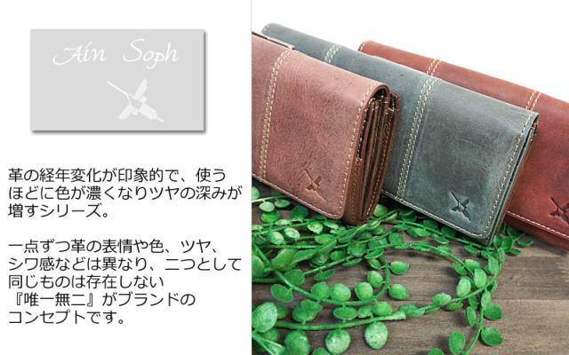 ブランド当初から続くアインソフを代表する定番レザーを使用したがまぐちの長財布です。