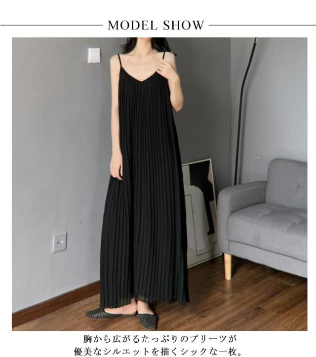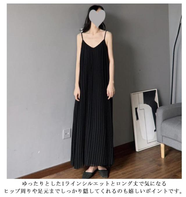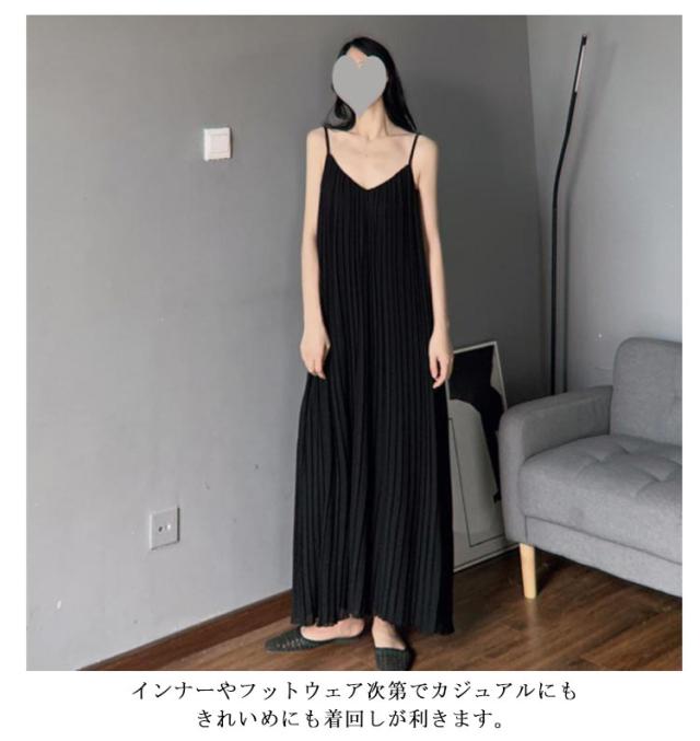 キャミワンピース ロング Vネック レディース キャミソール プリーツ ワンピース キャミワンピ プリーツワンピ ロングワンピース Iライン 体型カバー 大人可愛い 韓国風 おしゃれ ブラック 黒 春 夏 レイヤード コーデ モード 【送無】