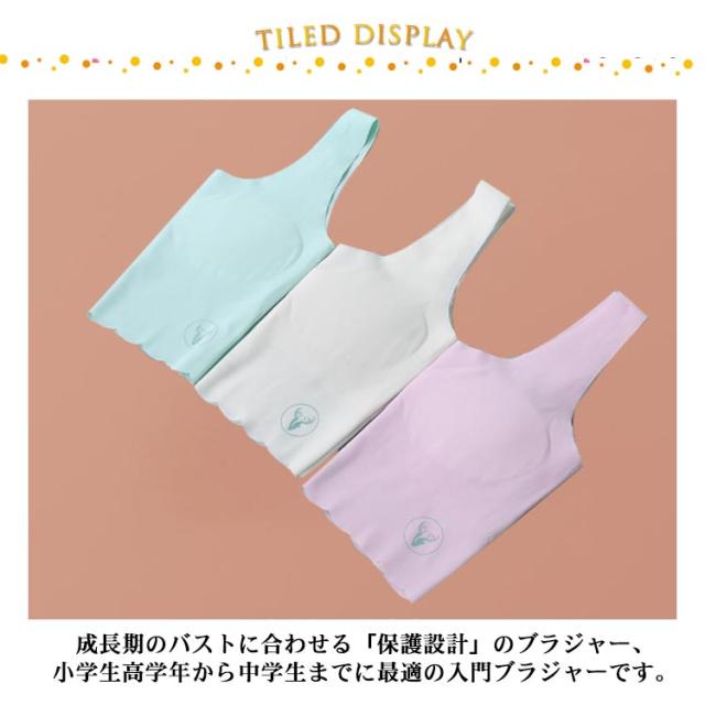 | アウターに響かず、激しい動きでもしっかりフィットする子どもブラジャー。 成長期のバストに合わせる「保護設計」のブラジャー、小学生高学年から中学生までに最適の入門ブラジャーです。 締め付け感のない素肌感覚の軽い着心地で、バストラインを優しく包みます。 肌あたりに配慮したシームレスデザイン、ゴロつかないフラットで滑らかな着心地が魅力です。 ファストブラに最適!通気性・吸湿性に優れ、汗ばむ季節も快適にお過ごしいただけます。 波模様のアンダー部分がかわいさと機能性を両立したおすすめの一品です。 | |