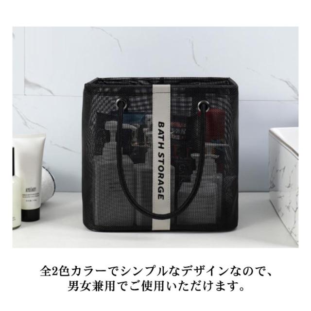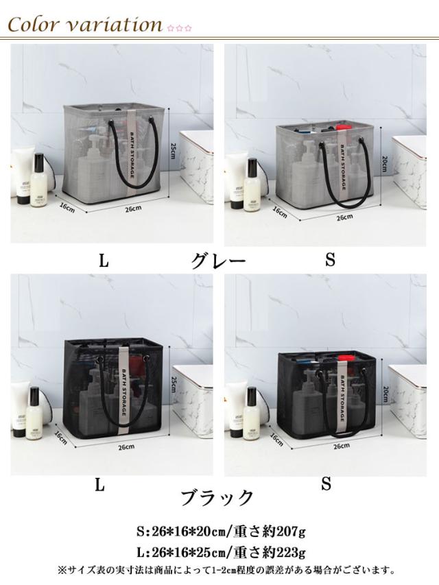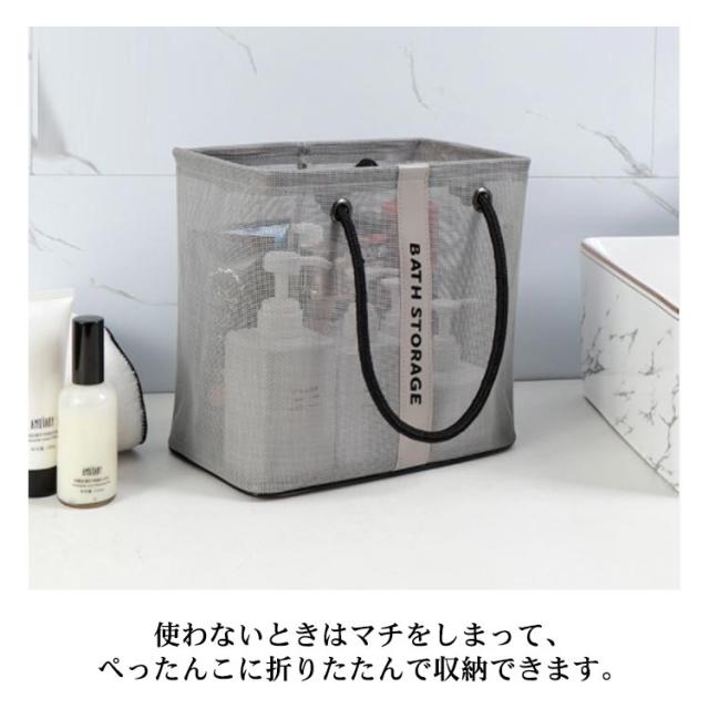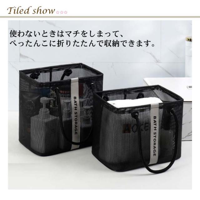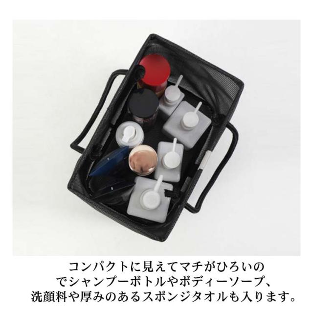 | 入浴/プール/温泉に欠かせないメッシュお風呂バッグ 使わないときはマチをしまって、ぺったんこに折りたたんで収納できます。 濡れた小物を入れても通気性が良いので、衛生的。 コンパクトに見えてマチがひろいのでシャンプーボトルやボディーソープ、洗顔料や厚みのあるスポンジタオルも入ります。 銭湯や温泉で使う温泉バッグだけではなく、スパ、プール用として自分専用のボディーケアグッズやスキンケアグッズの入れ物としてもおすすめです。 使わないときはマチをしまって、ぺったんこに折りたたんで収納できます。 全2色カラーでシンプルなデザインなので、男女兼用でご使用いただけます。 | |