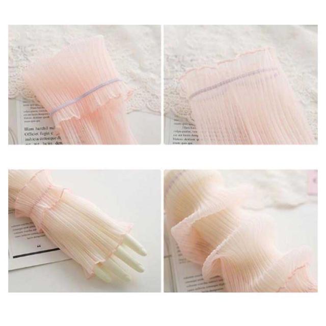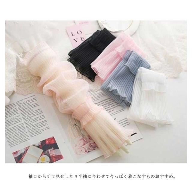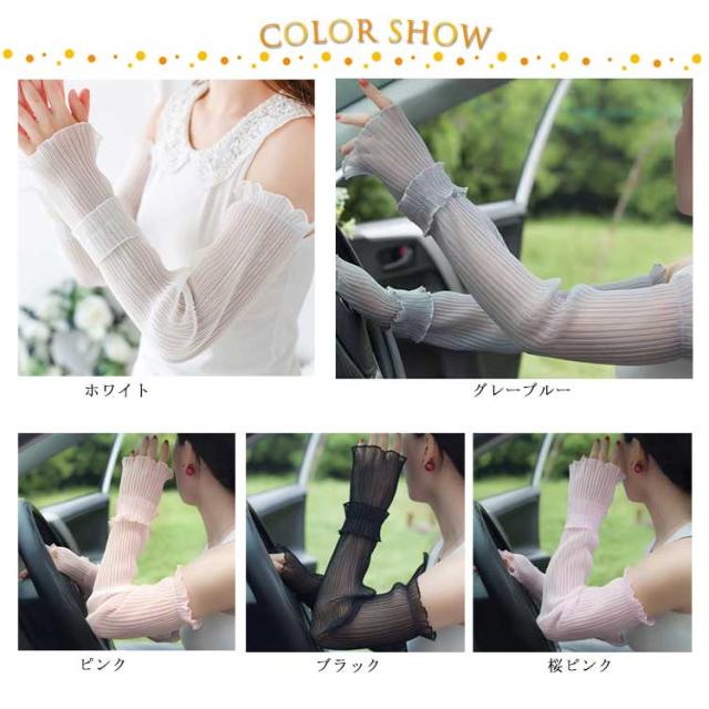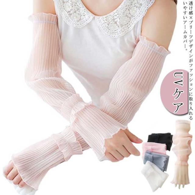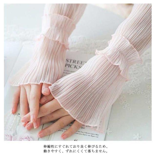 アームカバー アームスリーブ レディース 涼しい 透け感 シアー UVケア 冷感 接触冷感 アイスシルク 可愛い uv uvカット 日除け 日よけ 腕カバー 指なし 作業 フリル プリーツ ロング アームカバー 運転 自転車 おしゃれ 腕 日焼け対策 日焼け防止 ずれない