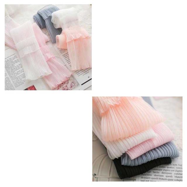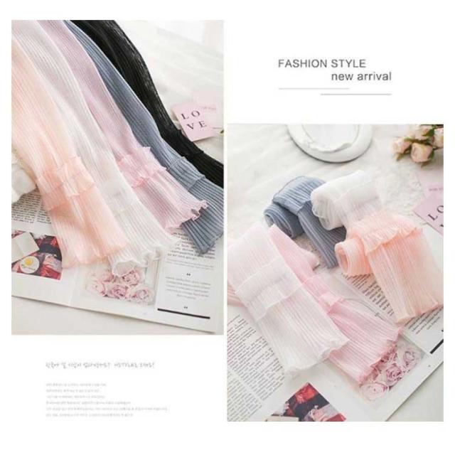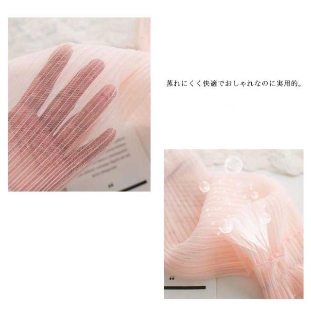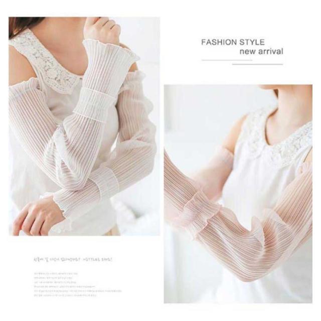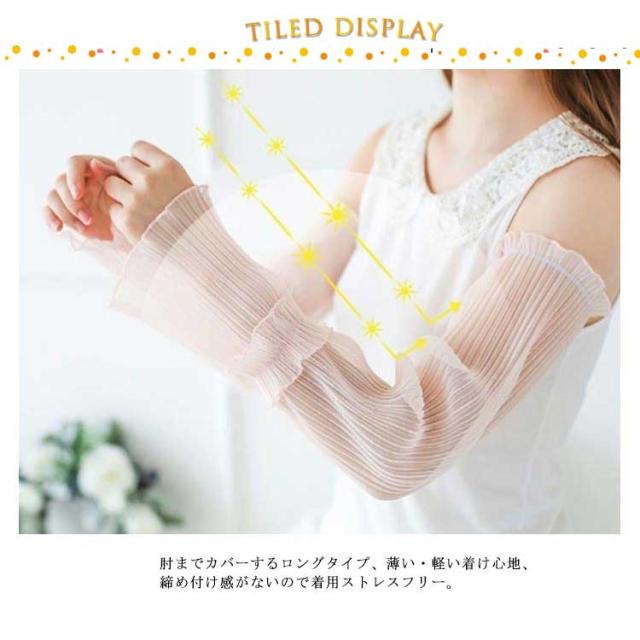 | 透け感×プリーツデザインがファッションに取り入れるいやすいアームカバー。 肘までカバーするロングタイプ、薄い・軽い着け心地、締め付け感がないので着用ストレスフリー。 伸縮性にすぐれており良く伸びるため、動きやすく、ずれにくくて落ちません。 蒸れにくく快適でおしゃれなのに実用的。袖口からチラ見せしたり半袖に合わせて今っぽく着こなすものおすすめ。 | |