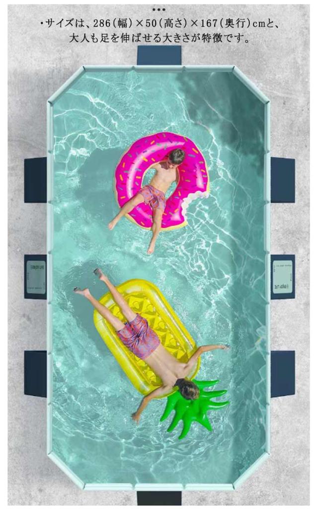 | ・折りたたみ式で簡単設置がうれしい!家族で遊べるプール ・広げるだけですぐにプールに入れます! ・大人も子供も楽しく遊べるたっぷりサイズで使い心地とっても良いですね。 ・サイズは、286(幅)×50(高さ)×167(奥行)cmと、大人も足を伸ばせる大きさが特徴です。 ・複合強化ボードが内蔵されているので、耐久性が高く安定しています。 ・排水栓も側面と下のほう、2か所に付いていますので簡単に抜くことができ、短時間で排水可能です。 ・また、折りたたみが簡単でコンパクトサイズにして収納できるのがうれしいポイントです。 | |