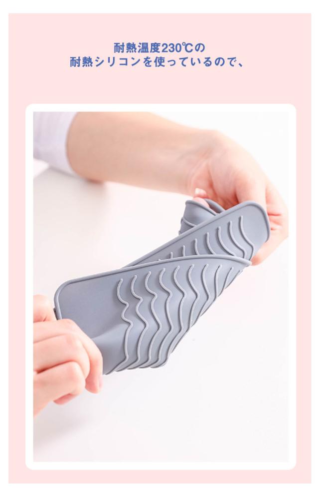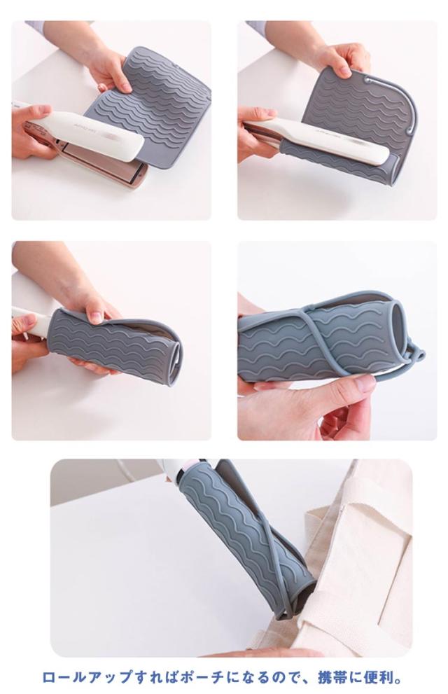 | 【多機能&マット&ポーチ】 耐熱シリコンマット&ポーチを使うことできます。 ヘアアイロンの熱からあなたの大切なドレッサーやバッグを焦げから守ります 【耐熱温度230℃】 耐熱温度230℃の耐熱シリコンを使っているので、 熱くなったヘアアイロンを使用後にヘアアイロンカバーで包めば、 即座にヘアアイロンを引き出しにしまうことができます。 【旅行や出張に便利】 開いて使えばヘアアイロン用のマットになるし、 ロールアップすればポーチになるので、携帯に便利。 【スリップ防止素材】 マットとして使えば、滑り止め加工されている のでヘアアイロンの落下を防いでくれます。 | |