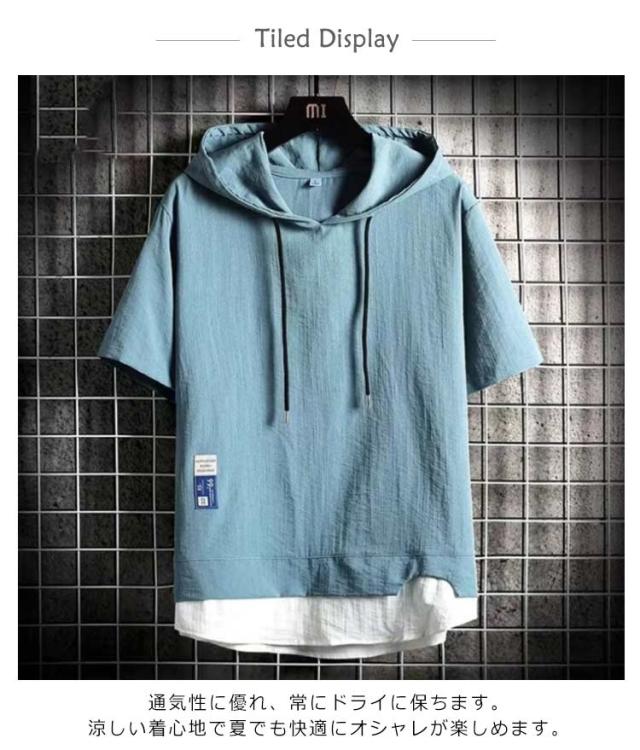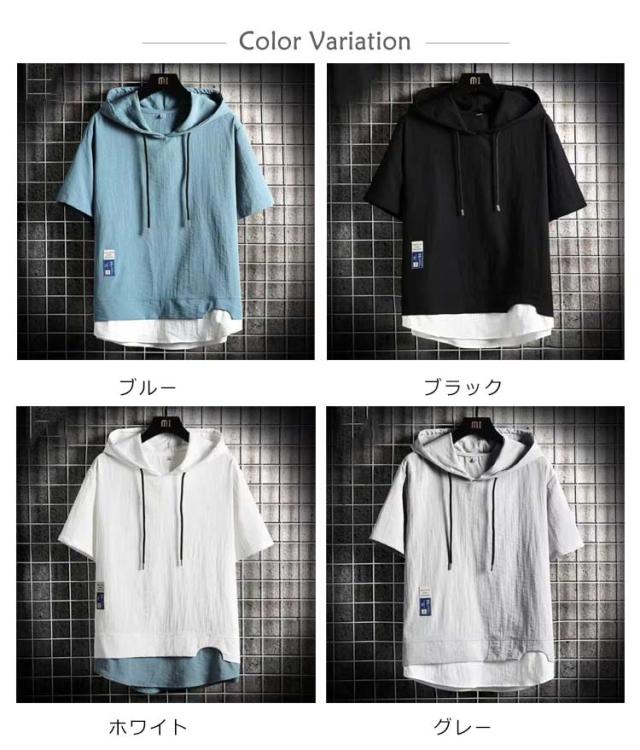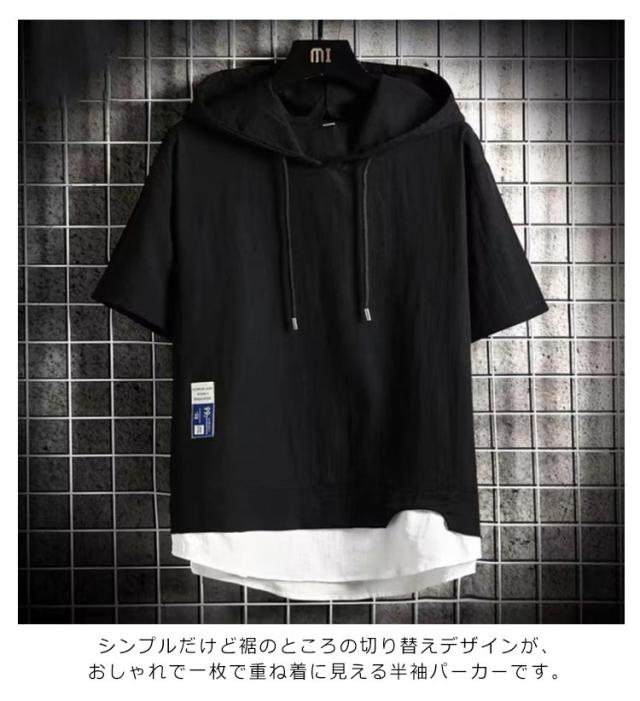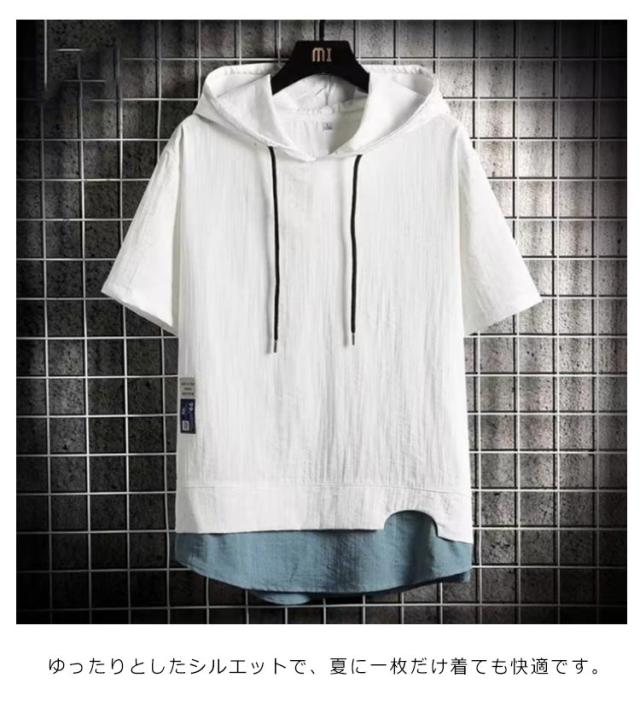 接触冷感 パーカー メンズ 半袖パーカー 半袖 パーカー レイヤード風 フード付きtシャツ プルオーバーパーカー 薄手 切り替え 夏服 涼しい 冷感 トップス シンプル 夏 韓国 メンズファッション ブルー 白 グレー 黒 清涼 ゆったり おしゃれ