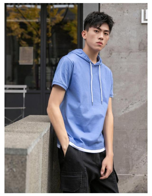 半袖 パーカー メンズ 半袖パーカー レイヤード風 フード付きtシャツ プルオーバーパーカー 薄手 切り替え 夏服 トップス メンズ 韓国ファッション おしゃれ 夏パーカー コットン スウェット Tシャツ 半袖 送料無料