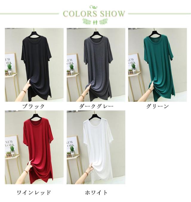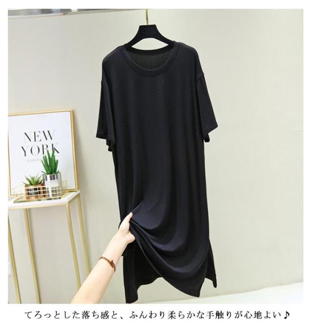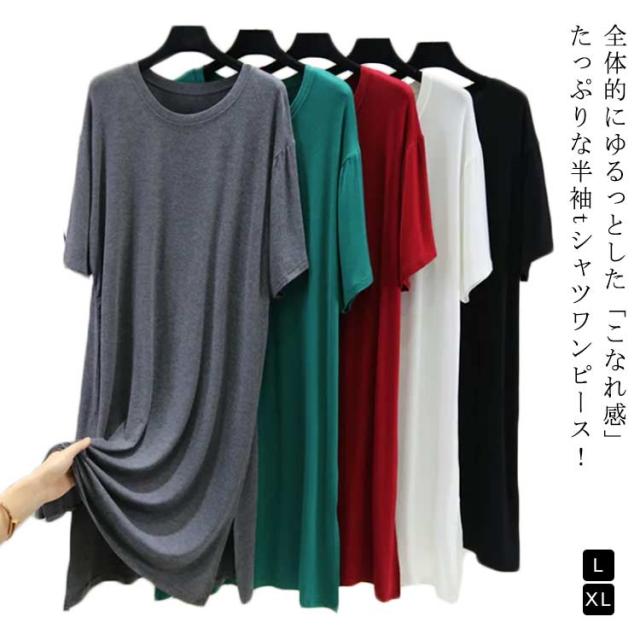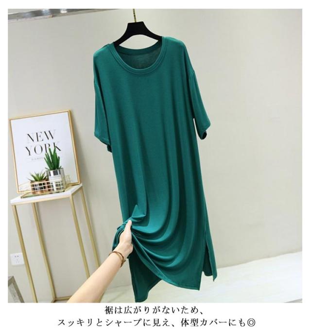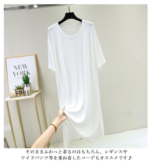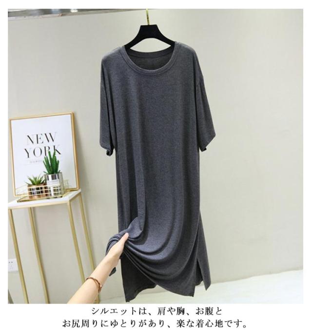 Tシャツ ワンピース 半袖 Tシャツワンピース レディース 部屋着 ルームウェア ゆったり ワンピース 大きいサイズ 冷感シャツ アイスシルク カットソー 半袖 無地 クルーネック ひざ丈 ロング丈 薄手 サイドスリット オーバーサイズ 春 夏 秋 送料無料
