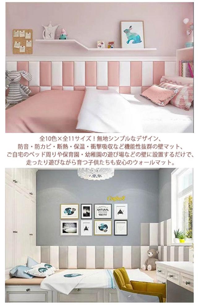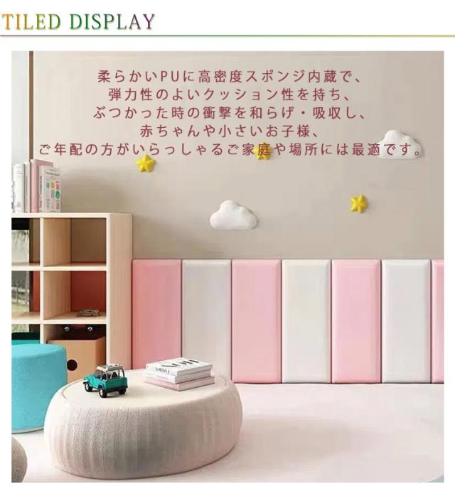 | 3.8cmの厚さ!安全を強力に守ってくれる壁クッション。 柔らかいPUに高密度スポンジ内蔵で、弾力性のよいクッション性を持ち、ぶつかった時の衝撃を和らげ・吸収し、赤ちゃんや小さいお子様、ご年配の方がいらっしゃるご家庭や場所には最適です。 PUレザーを採用し、防水、汚れがつきにくく、お掃除もかんたん。 全10色×全11サイズ!無地シンプルなデザイン、防音・防カビ・断熱・保温・衝撃吸収など機能性抜群の壁マット、ご自宅のベッド周りや保育園・幼稚園の遊び場などの壁に設置するだけで、走ったり遊びながら育つ子供たちも安心のウォールマット。 | |