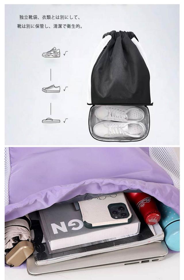 | ドライ&ウェット分離スイミングバッグ! 独立靴袋、衣類とは別にして、靴は別に保管し、清潔で衛生的。 耐摩耗性、引っ掻き性、防水生地。 メインバッグは巾着口、開閉が便利! 撥水加工で急な雨の日でも安心に!プールバッグや運動クラブ用バッグにピッタリです。 運動の汗の侵入を簡単に防げ、突然の豪雨に濡らされる心配もいりません。 男女問わず実用性とデザイン性を兼ね備えるリュックスタイルのナップサック。 ヨガやジムなど室内スポーツ用のジムバッグや水泳、スイミング教室、ビーチ遊び、海遊び、水遊び、磯遊びグッズのお片付けプールバッグや部活動、夏休みイベント、温泉旅行、修学旅行、花見、花火大会、お祭り時の着替え衣類と浴衣収納用の巾着バッグやちょっとした買い物や防災時の非常持ち出し袋にもご使用いただけます。 | |
