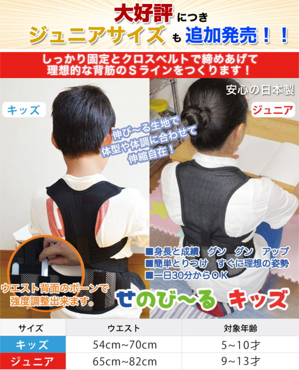 子供の時に正しい姿勢を!お子様の姿勢をサポートする背筋ベルト。宿題をする時、テレビを見る時、ゲームをする時、お子様の姿勢が気になる方へ!ウエストを固定し、締め上げベルトを脇から通し引っ張る事で、理想的な背筋のSラインに近づけます。ウエスト部分にボーンを装着でき、着けることでハードに、外すことでソフトにと着用感を調節できます。ウエストベルト・背面ベルト、ともにメッシュ素材なので、オールシーズンでご使用いただけます。ご使用は1日30分からでOK!好きな時間、好きな場所で始められ安心の日本製です。伸びる生地で子供の体型や体調に合わせて伸縮自在です。サイズは、キッズサイズとジュニアサイズの2種類からお選びください。