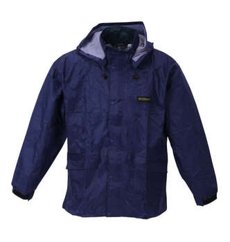 着脱しやすいフロントファスナーに撥水機能を備えたウィンターチェリーのレインスーツ。