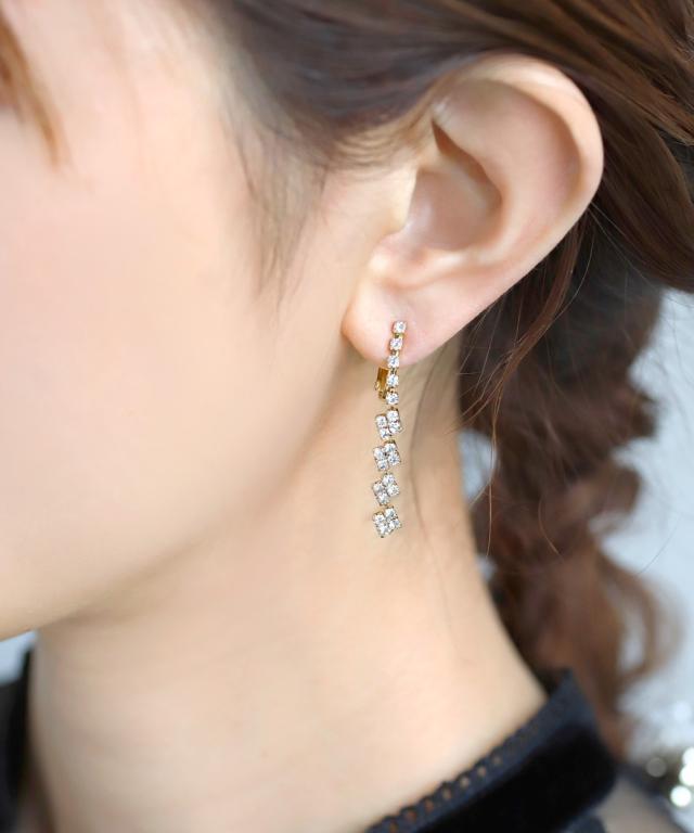 煌めくスクエアビジューが連なり、横顔を華やかに演出するイヤリング。