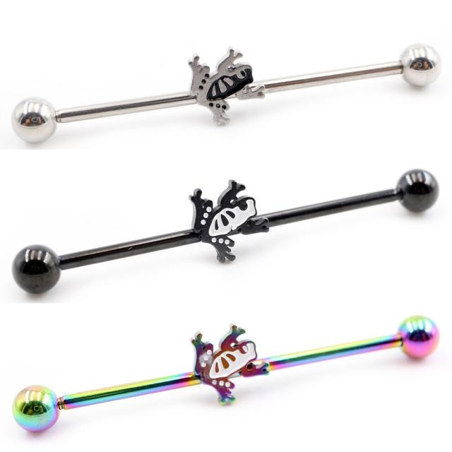 黒色ブラックカラー、虹色レインボーマルチカラー、銀色シルバーカラーの14ゲージの長いロングバーベルに蛙(かえる)のモチーフをセットしたインダストリアル用ボディピアス。