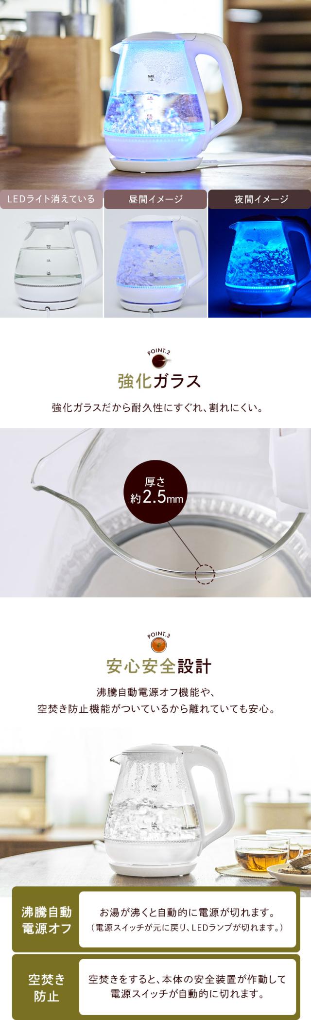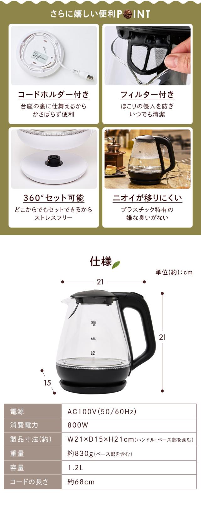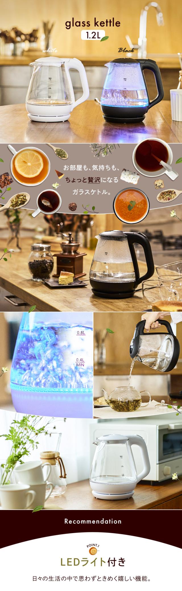 ケトル 1.2L 電気ケトル ガラス おしゃれ ガラスケトル HKG-012 全2色 ガラスケトル 1.2L 空焚き防止機能 安心安全設計 LED点灯 LEDライト付き 強化ガラス ケトル ガラス製 大容量 お手入れ簡単 かわいい 電気ケトル ケトル ガラス 送料無料
