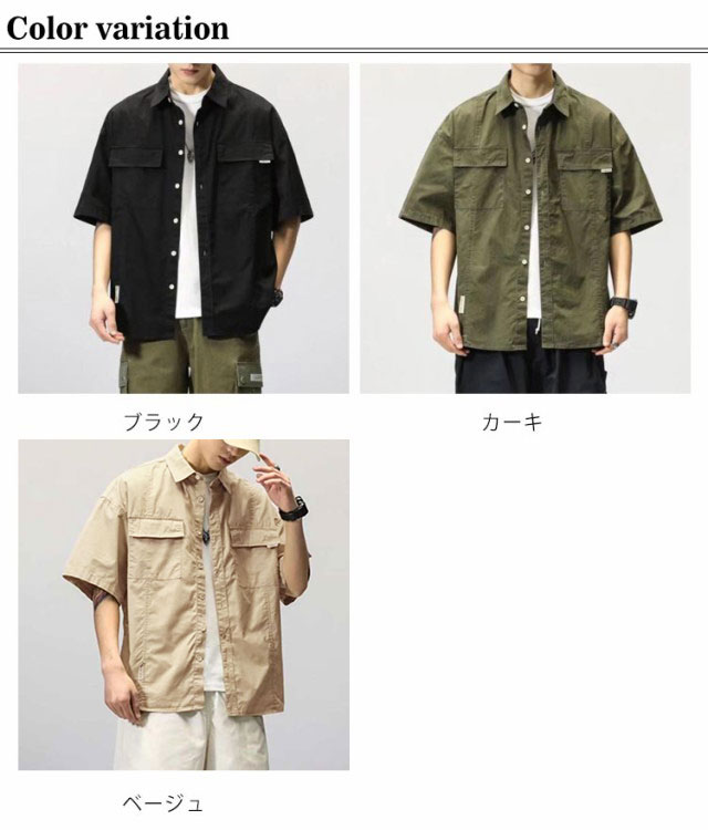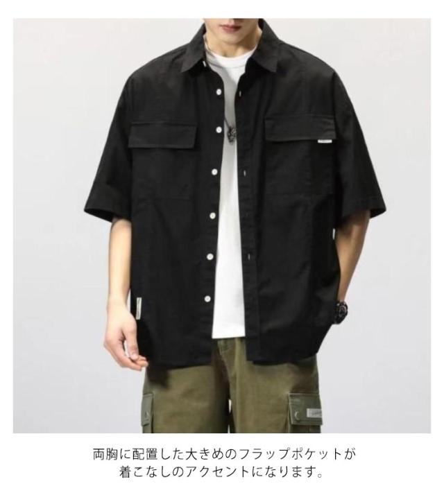 ミリタリー シャツジャケット メンズ ミリタリージャケット 半袖 5分袖 サマージャケット 春 秋 夏 アウター 羽織り ライトアウター オーバーサイズ ミリタリーシャツ カジュアルシャツ 無地 カーキ 黒 フラップポケット