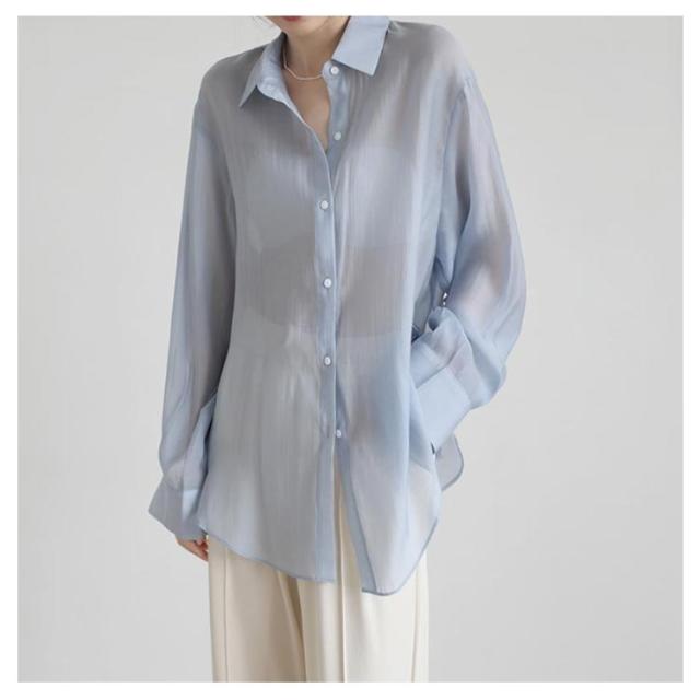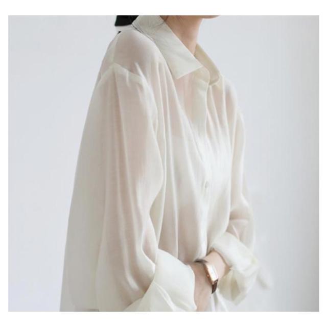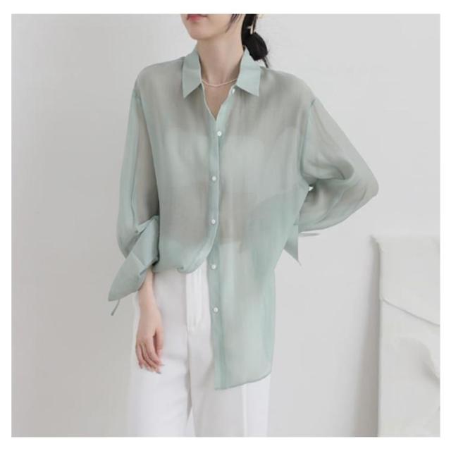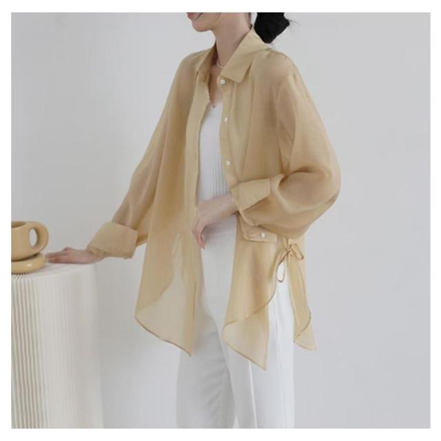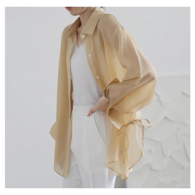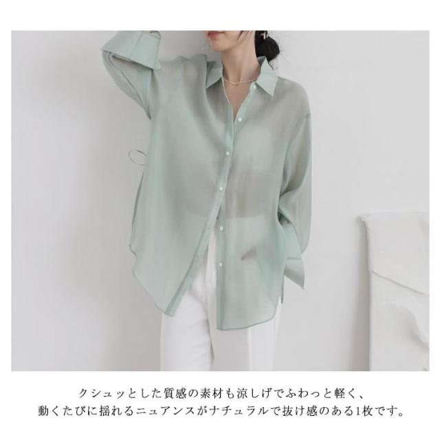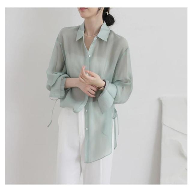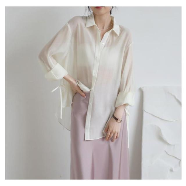 | 大人ガーリーなスタイルをつくるシアーシャツ。 リボンで結ぶ仕様のサイドスリットが涼しげでトレンド感たっぷり! ボタンを開ければ解放感のあるリラックスしたムードが漂う大人の新定番! ニットとのレイヤードスタイルでも、前を開けて羽織りスタイルでも着合わせやすい。 そのまま1枚で着るのはもちろん、カーデ感覚で日焼け対策にも。 クシュッとした質感の素材も涼しげでふわっと軽く、動くたびに揺れるニュアンスがナチュラルで抜け感のある1枚です。 | |