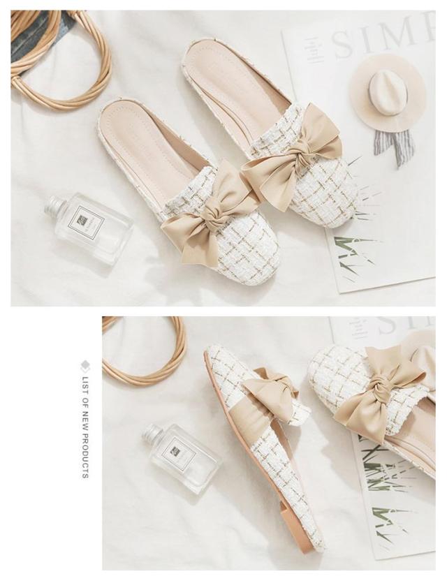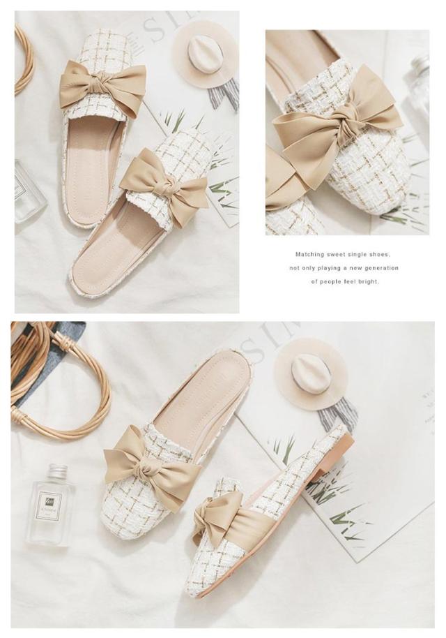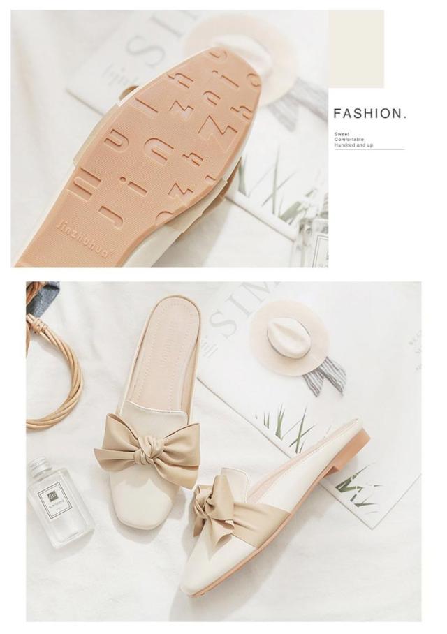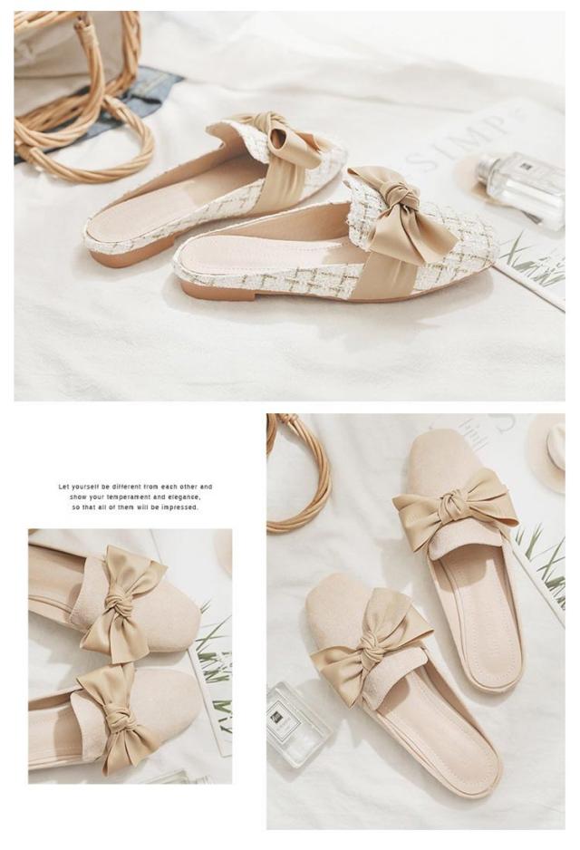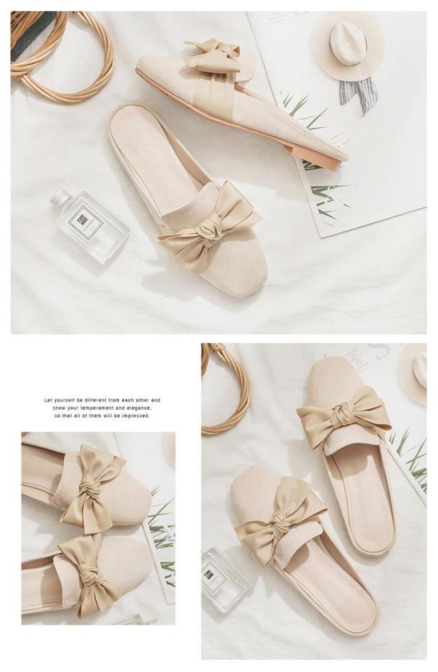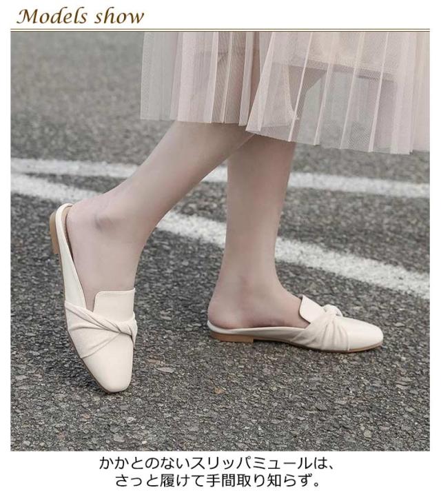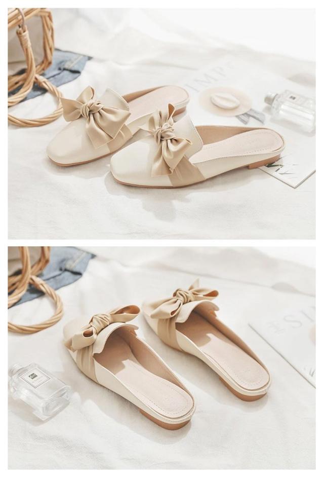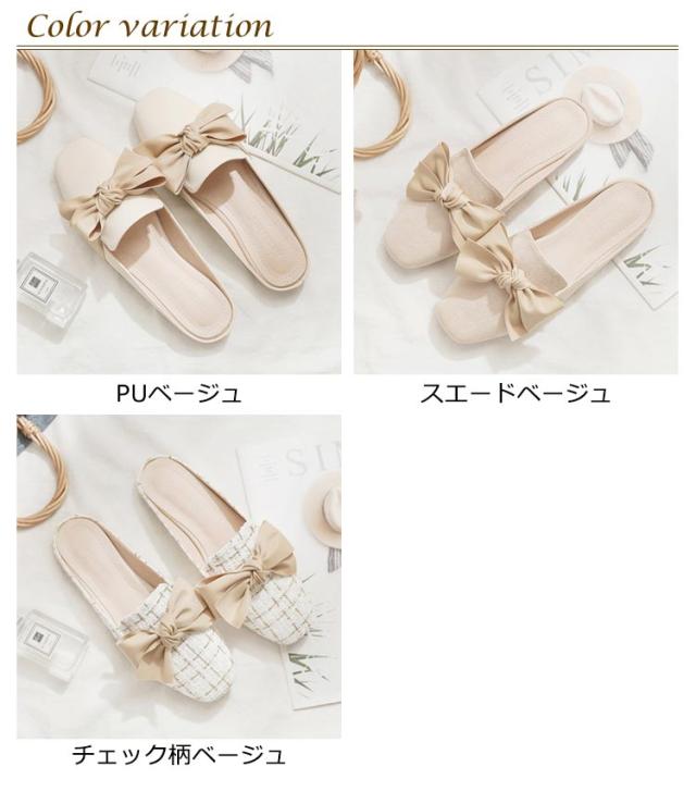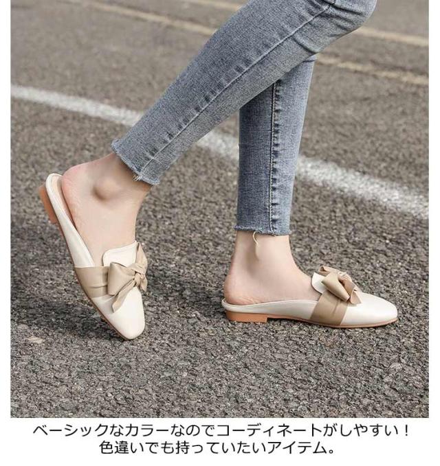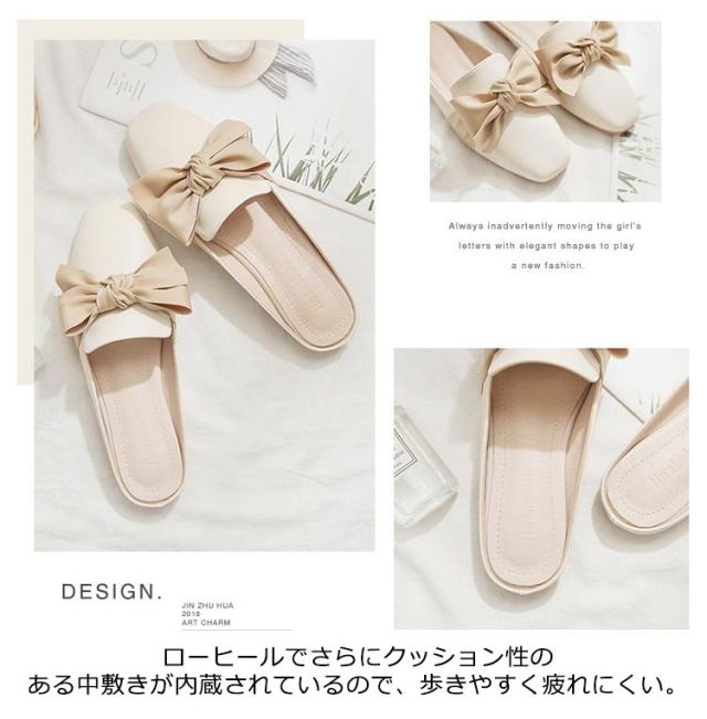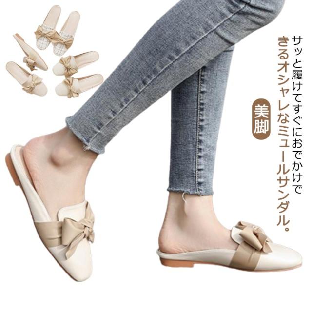 送料無料 ミュールパンプス レディース ミュール サンダル かかとなし ローヒール 歩きやすい ペタンコ PUレザー スクエアトゥ スリッポン シューズ 靴 外履きスリッパ リボン付き 春夏 お洒落 カジュアル 脚長 美脚 きれいめ