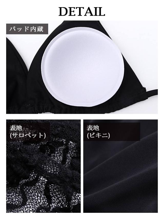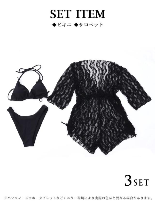 ☆ワンカラーでシンプルな総レースのロンパースと三角ビキニにの大人可愛い三点セットビキニです。