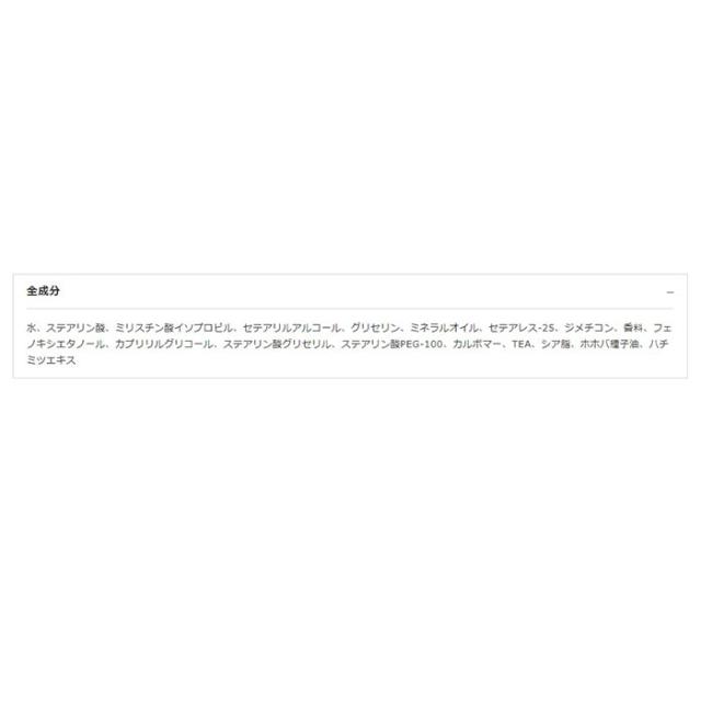 | 成分 | [共通] 水、ステアリン酸、ミリスチン酸イソプロピル セテアリルアルコール、グリセリン、ミネラルオイル セテアレス-25、ジメチコン、香料 フェノキシエタノール、カプリリルグリコール ステアリン酸グリセリル、ステアリン酸PEG-100 カルボマー、TEA、シア脂 ホホバ種子油、ハチミツエキス |