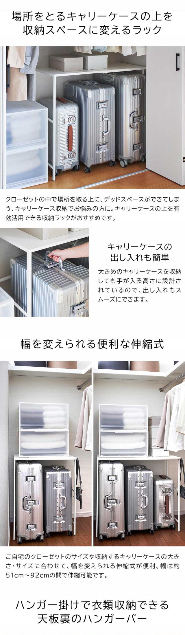キャリーケースの上のデッドスペースを有効活用できる収納ラック。ご自宅のクローゼットサイズやキャリーケースの個数に合わせて幅を伸縮。洋服も掛けられるハンガーバー付き