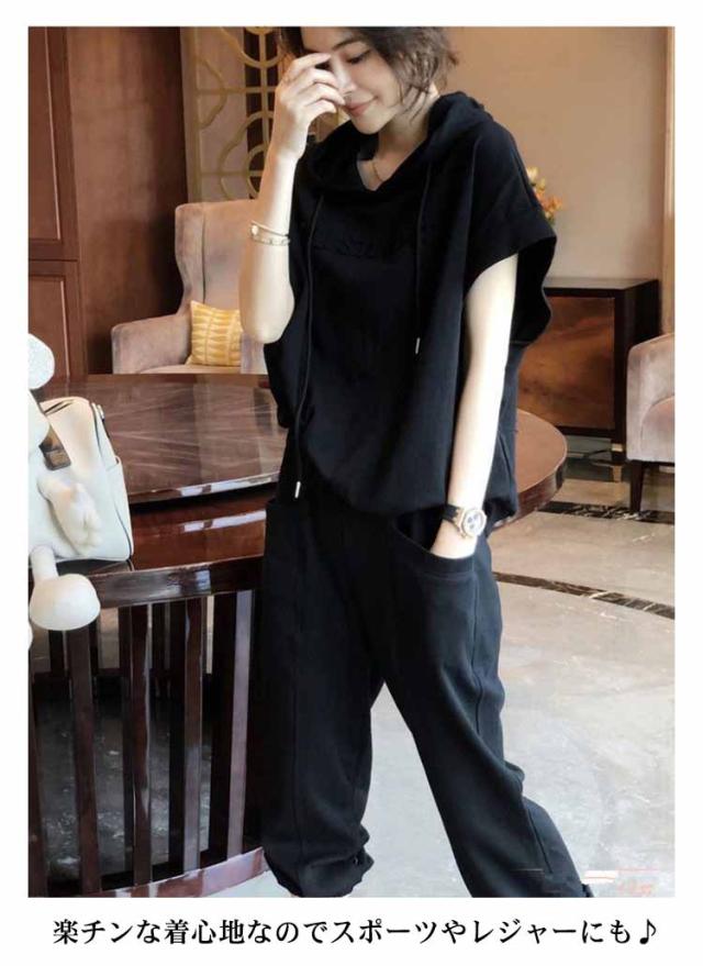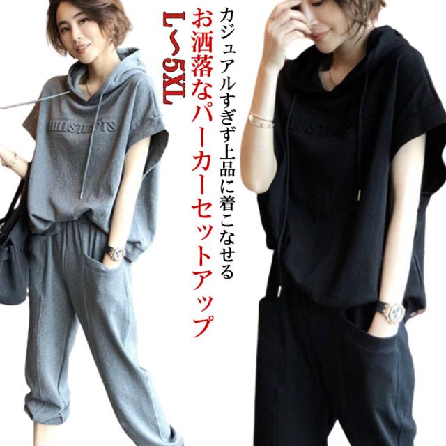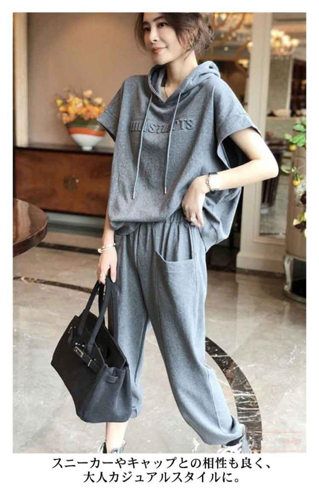 カジュアルセットアップ レディース スウェット 2点 上下セット 半袖 おしゃれ 夏 ジャージ フード付き スウェットパンツ 無地 ゆったり 着痩せ 体型カバー 春秋 大きいサイズ シンプル 部屋着 運動着 スポーツ お出かけ ギフト 送料無料