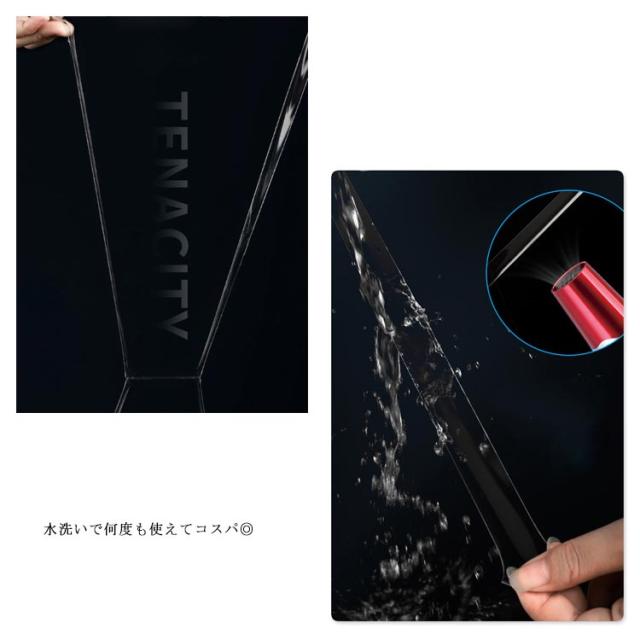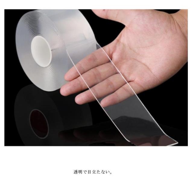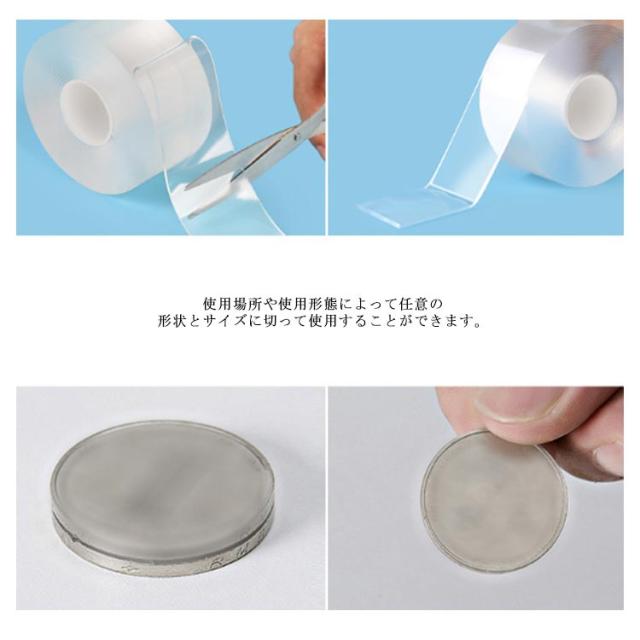 | 貼って剥がせる!水洗い可能!繰り返し使える!超強力魔法の両面テープ 透明で目立たない。 跡を残さず剥がせます。 水洗いで何度も使えてコスパ◎ 多機能!玄関や台所、客室、洗面所からなどの地震対策、滑り止め、テレビの固定、カーペットの滑り止め、小物収納や置物固定などマルチにご利用いただけます。 使用場所や使用形態によって任意の形状とサイズに切って使用することができます。 対応可能の素材が、木製品、ガラスや金属、タイル、革、大理石、プラスチックなど非常に多く、柔軟に使用できます。 | |