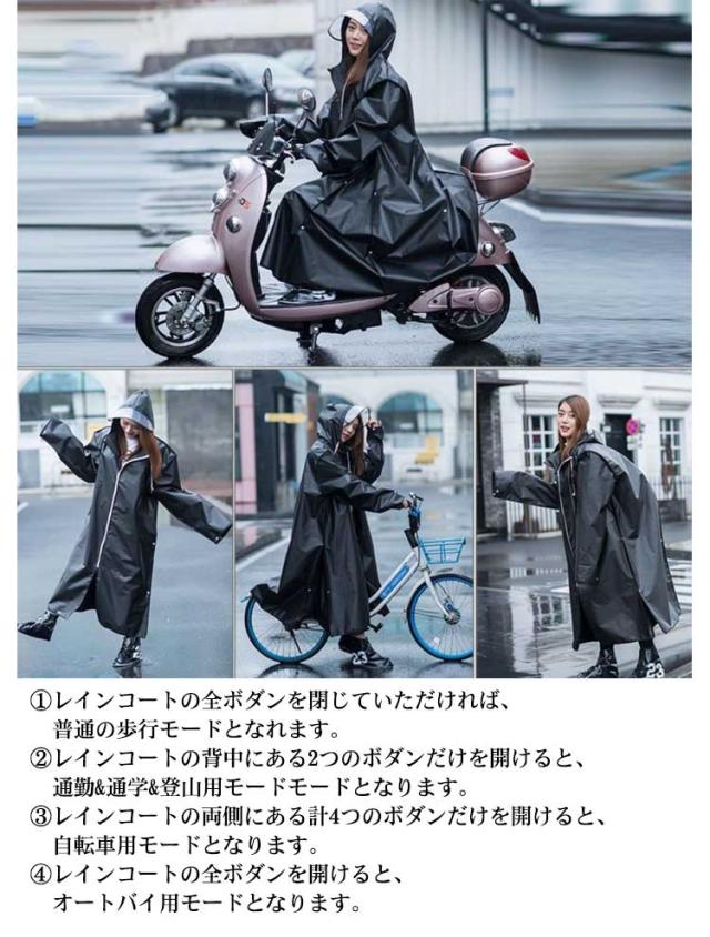 | ロング丈のカラーつば付きレインコートです。 環境と耐久性に優れたエコ素材のEVAを採用し、手触りはすべすべで触り心地がよく、丈夫で防水力も高いです。 一つ大きめサイズで、防寒着の上にも楽々着用できます。 濡れた椅子に座っても浸みてこないので快適に過ごせます。 袖口を絞れて自転車利用時に助かります、寒さ避けにもなります。 フードをかぶると、顔はほぼ隠せるので濡れにくいです。 ?レインコートの全ボダンを閉じていただければ、普通の歩行モードとなれます。 ?レインコートの背中にある2つのボダンだけを開けると、通勤通学登山用モードモードとなります。 ?レインコートの両側にある計4つのボダンだけを開けると、自転車用モードとなります。 ?レインコートの全ボダンを開けると、オートバイ用モードとなります。 | |