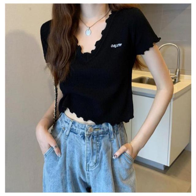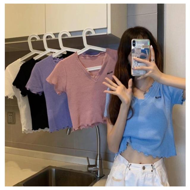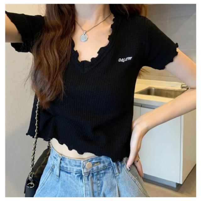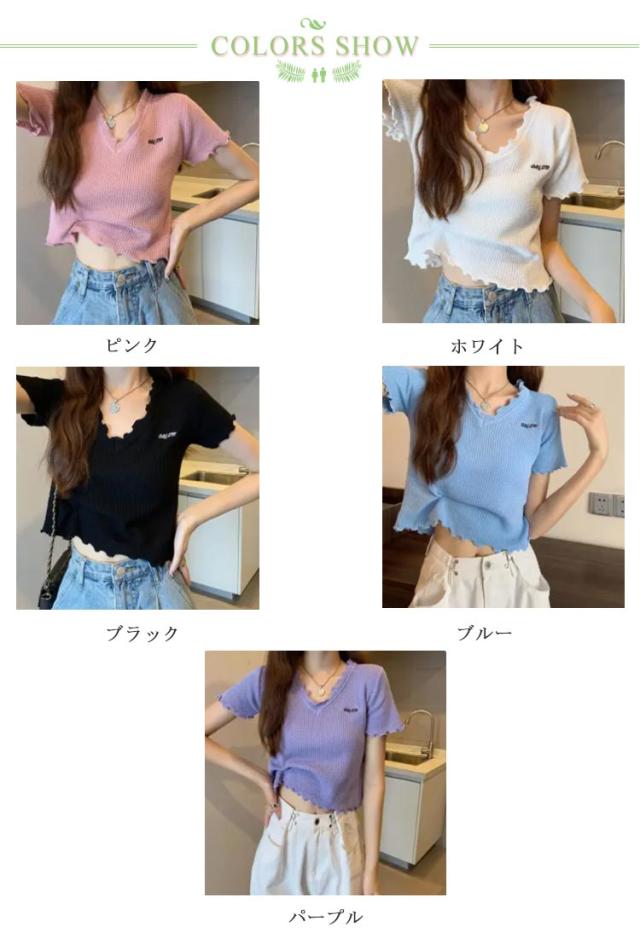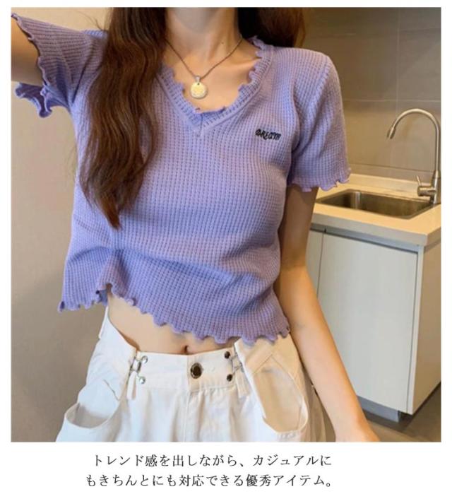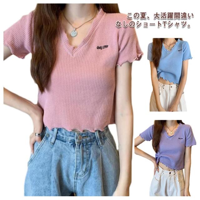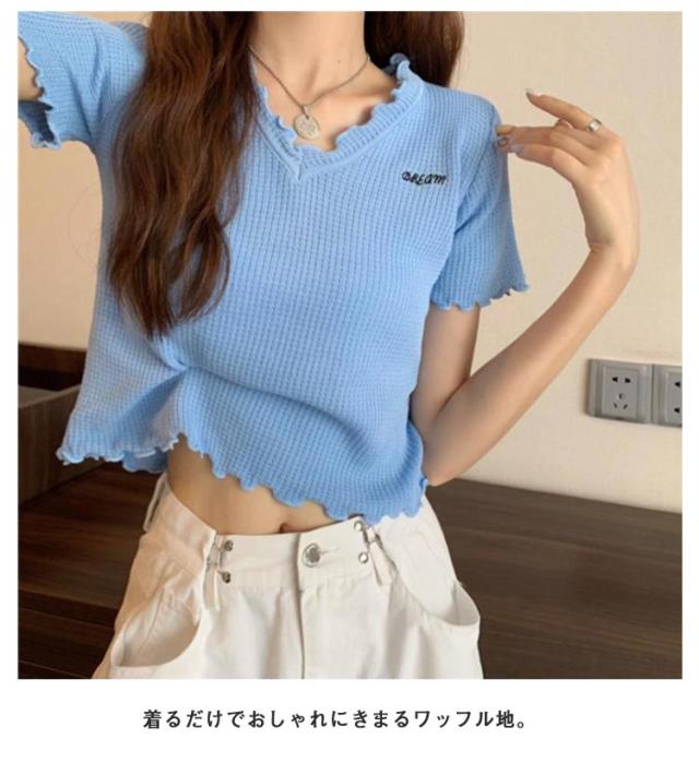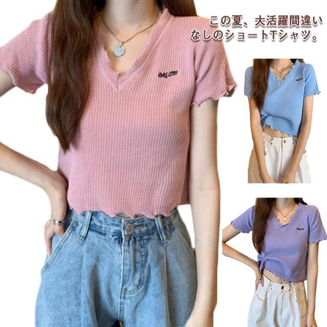 【送料無料】Tシャツ ショート丈 トップス 無地 半袖 フリル リブ ギャザー Vネック Tシャツ カットソー ワッフル 半袖Tシャツ ショート丈 へそ出し レディース トップス 女性 Tシャツ クロップド丈 半袖 プルオーバー