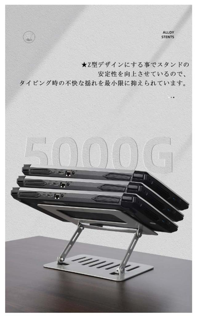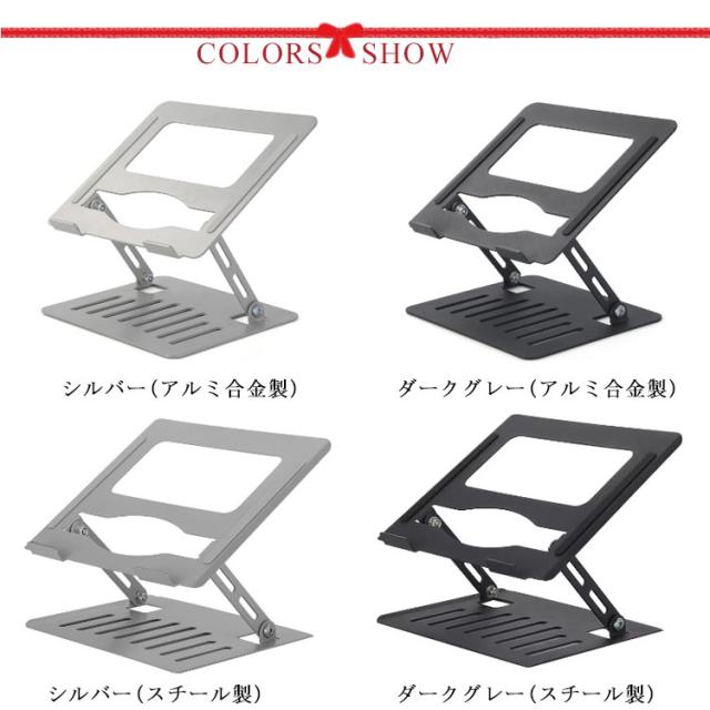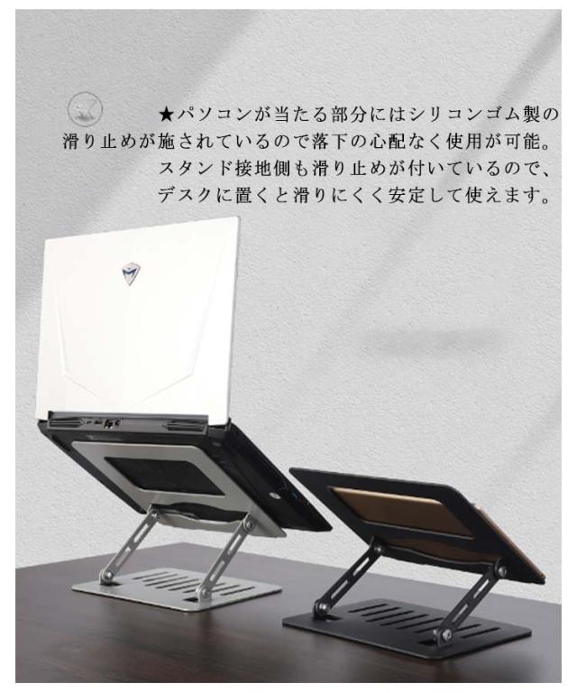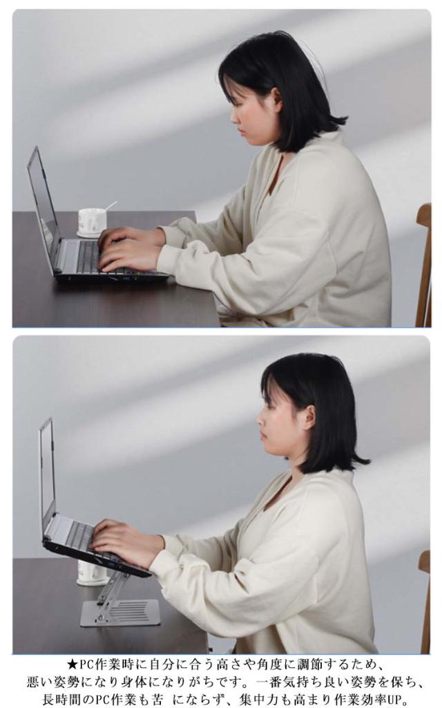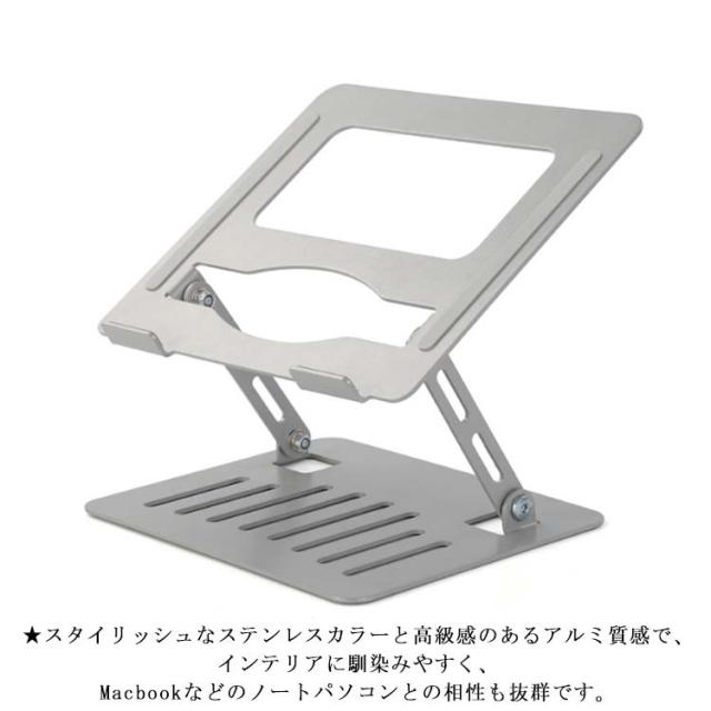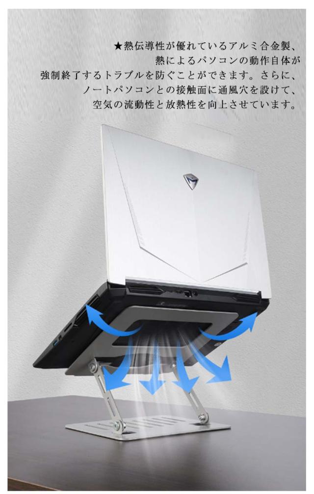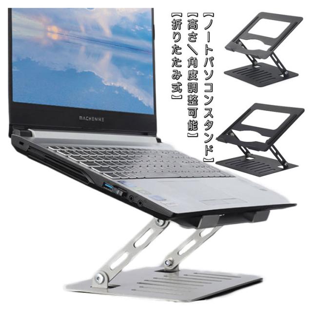 | 【ノートパソコンスタンド】【高さ/角度調整可能】【折りたたみ式】 ★人間工学に基づいた設計により、高さを調節できて、台座の傾斜角度も変えられますので、自身を合わせて最適な姿勢を整えて、首、肩、背中などへの負担が軽減されています。 ★回転軸部分は耐久性を高める特殊処理で、摩擦に強く、角度や高さが自由自在に調整可能ですが安定感も抜群。 ★PC作業時に自分に合う高さや角度に調節するため、悪い姿勢になり身体になりがちです。一番気持ち良い姿勢を保ち、長時間のPC作業も苦 にならず、集中力も高まり作業効率UP。 ★Z型デザインにする事でスタンドの安定性を向上させているので、タイピング時の不快な揺れを最小限に抑えられています。 ★11〜17インチまでのさまざまなノートPCやタブレットを幅広く対応可能です。 ★熱伝導性が優れているアルミ合金製、熱によるパソコンの動作自体が強制終了するトラブルを防ぐことができます。さらに、ノートパソコンとの接触面に通風穴を設けて、空気の流動性と放熱性を向上させています。 ★折りたたみ式ノートパソコンスタンドなので、簡単に折畳ってカバンの中に収納して持ち運べてでかけて、カフェや新幹線、飛行機移動中、出張、展示会など様々シーンに活躍できます。 ★パソコンが当たる部分にはシリコンゴム製の滑り止めが施されているので落下の心配なく使用が可能。スタンド接地側も滑り止めが付いているので、デスクに置くと滑りにくく安定して使えます。 ★スタイリッシュなステンレスカラーと高級感のあるアルミ質感で、インテリアに馴染みやすく、Macbookなどのノートパソコンとの相性も抜群です。 | |