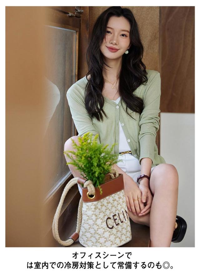 | 涼やかな素材感を定番シルエで仕上げたVネックサマーニットカーディガン。 カーディガンとして羽織りにしたり、ボタンを留めてプルオーバーとしても着回せるヘビロテ必須なアイテム。 透け感のあるカーディガンは、春夏もスッキリと着られるアイテムです。 深めVネックなので顔周りがすっきりまとまり、コーディネートも楽々。 に着用できるアイテムなので、ON・OFF問わず活躍します。 オフィスシーンでは室内での冷房対策として常備するのも◎。 ひんやりとした肌触りの接触冷感素材で汗ばむ季節にもすごしやすくお使いいただけます。 | |