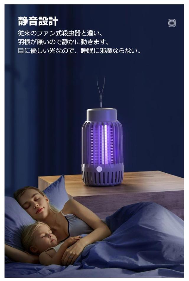 | USB充電式電撃殺虫機。コンパクトサイズで、持ち運びに便利!キャンプ用も◎! 【2023超強い電撃殺虫器】電撃殺虫器は高品質で環境保護ABS素材を採用し、360°全方位UV光源吸引式なので、物理的に蚊を殺します。内部には密集な静電ネット式な設計なので、虫などを逃げられないです。 【様々な場所で大活躍殺虫ライト】電撃殺虫器は吊り下げても据え置きでも使えるので、使い場所を選びません。 この電撃殺蚊灯はキッチン、リビングルーム、子供部屋、寝室、玄関、オフィス、飲食店など様々な場所でお使いいただけます。薬剤など一切使用していないので人体に無害です。 【USB充電、経済的で省エネ】USB充電式で、1200mAhバッテリー内蔵、約3時間の充電で、1回のフル充電で殺虫モードで約8時間の連続使用、照明モードで約10時間の連続使用、殺虫+照明モードで約6時間の連続使用が可能です。コンセントがない場所でも、で捕虫器を充電することができるので、持ち運びがしやすく、外出先でも使用することができます。 【静音設計】従来のファン式殺虫器と違い、羽根が無いので静かに動きます。目に優しい光なので、睡眠に邪魔ならない。 | |