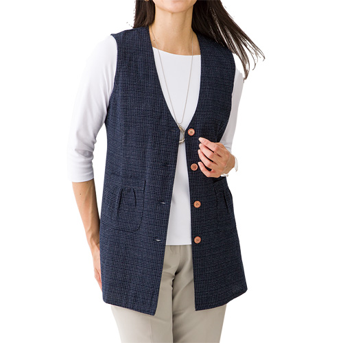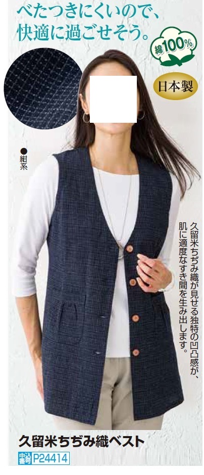 日本製 久留米ちぢみ織ベスト 紺色 前開き ベスト ジレ レディース 婦人服 ミセス シニア 女性 ネイビー 襟無し ポケット付き コットン 縮み織り 和素材 チョッキ ファッション 40代 50代 60代 70代 80代 母の日 お母さん 春物 夏物