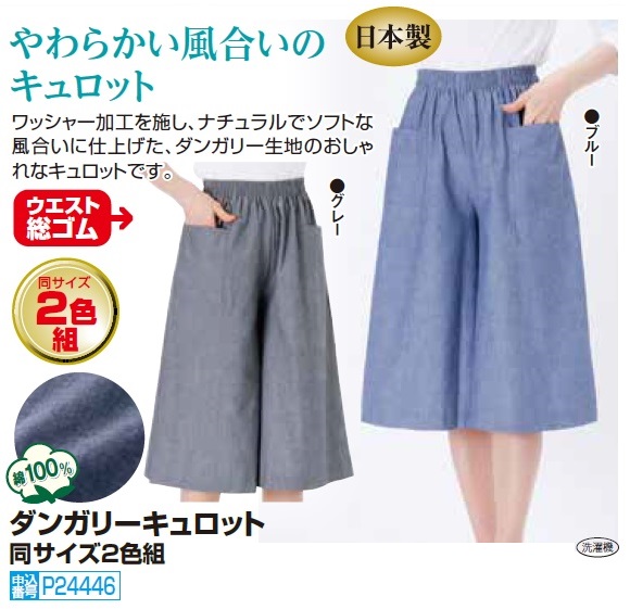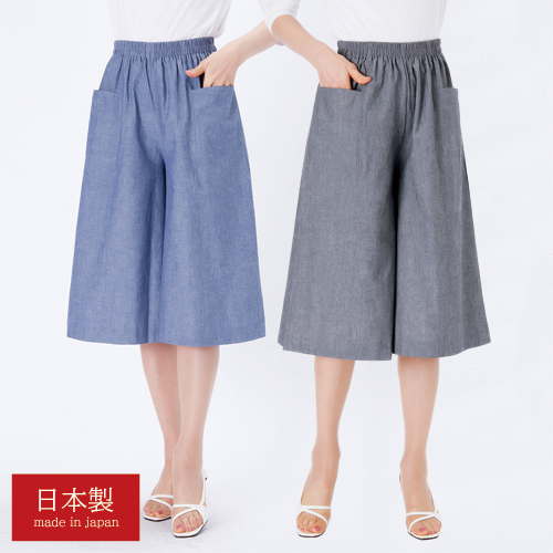 キュロットスカート ひざ下丈 ブルー グレー レディース 日本製 ダンガリーキュロット 2色組 大きいサイズ 婦人服 ミセス シニア 女性 キュロットパンツ 青 灰色 クロップド丈 シンプル 無地 ファッション 40代 50代 60代 70代 80代 母の日 お母さん 春夏 fuji p24446