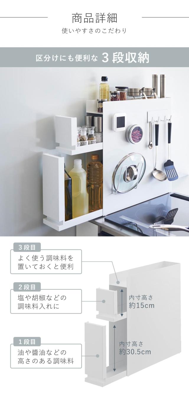 見た目もスッキリ整い、出し入れしやすい安定感とスムーズな使用感。ただ収納できるだけでなく、「快適に収納できること」を追求した調味料ラックです。