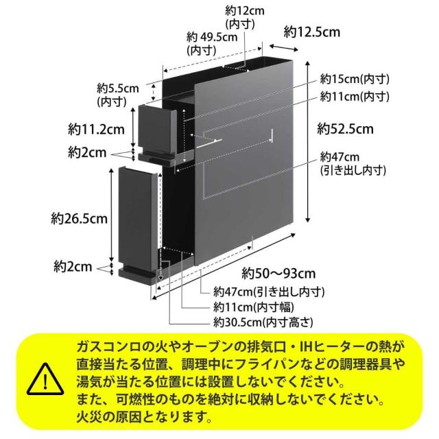 | サイズ | 外寸:約幅12.5×奥行50〜93×高さ52.5(cm) 下段引き出し:約幅11×奥行47×高さ30.3(cm) 上段引き出し:約幅11×奥行47×高さ15(cm) 最上段:約幅12×奥行49.5×高さ5.5(cm) |
