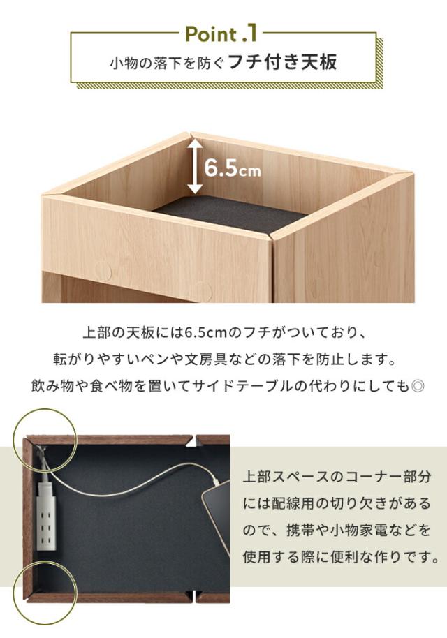 上部スペースのコーナー部分には配線用の切り欠きがあるので携帯や小物家電などを使用する際に便利な作りです。
