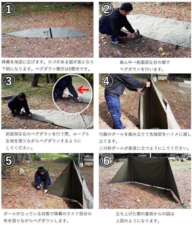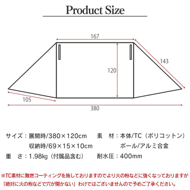 【TC素材】陣幕は比較的焚き火の近くで使用するギアとなりますので、間違いなく焚き火の火の粉が飛び散ります。そのため、難燃素材のTC素材を採用しています。さらにTC素材の上から難燃コーティングも施していますので、火の粉が飛んでしまった場合でも穴が空きにくい陣幕となります。 【アルミポールが付属】直径28mmのアルミ製ポールが2セット付属しています。このポールは現在、フューチャーフォックスで販売しているタープポールと全く同じものです。直径を太くしたことで、風に強いポールとなります。