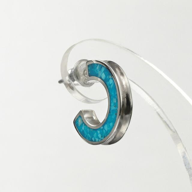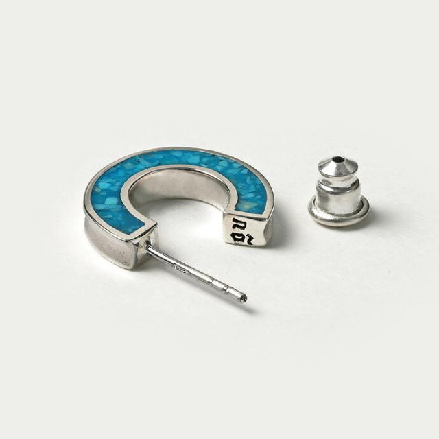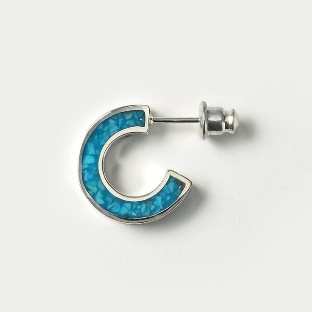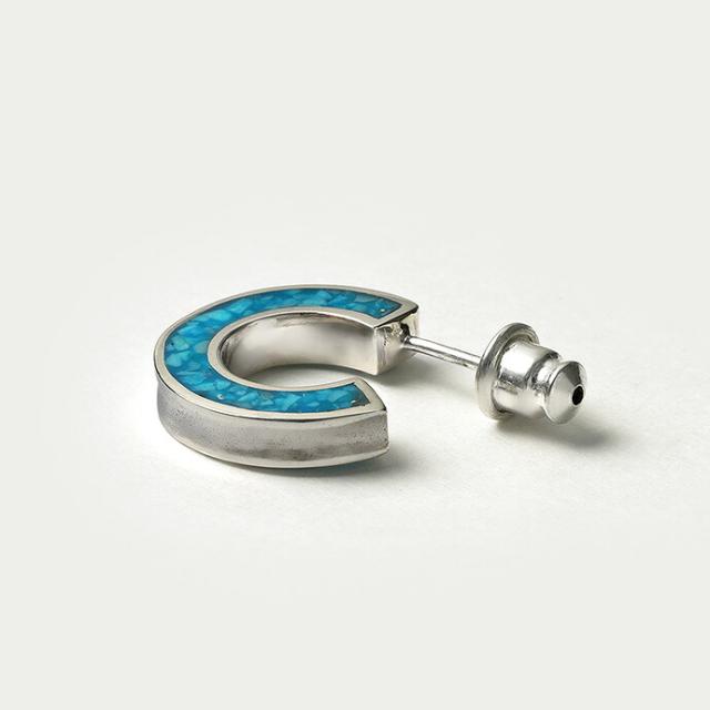 側面に大小様々な形のクラッシュターコイズを埋め込んだフープ型スタッドピアス。正面のシルバー部分にはくびれが入っており、そこから生まれる輝きがターコイズをさらに引き立てます。爽やかさを気軽に演出できる、男女問わずオススメのアイテムです。