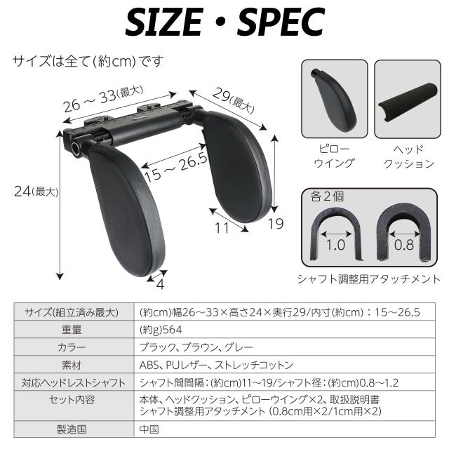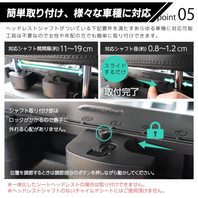 | 【適用車種】 | ヘッドレストのポールが付いている車両に対応できます。 ※一体化したシートヘッドレストの場合は取り付けできません。 対応ステー幅囲7cm-21cm。 伸縮機能付きでほとんどの車に装着可能です。 長時間のドライブ・車中泊などに最適。 |