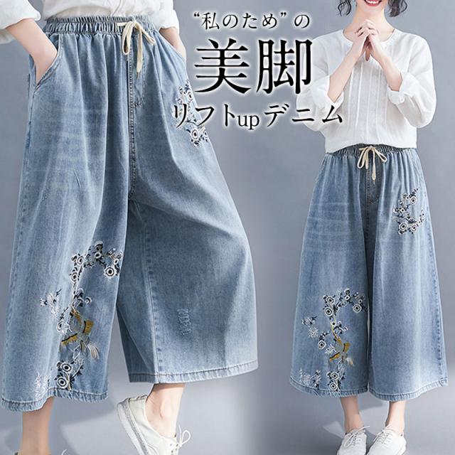【水曜日まで!10%クーポン配布中】 デニムパンツ ワイドパンツ レディース ストレッチ 花柄 ダメージ加工 カジュアル 伸縮 ユーズド感 ブリーチ ゆったり アメカジ おしゃれ 仕事着
